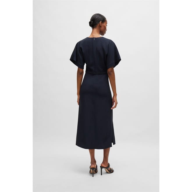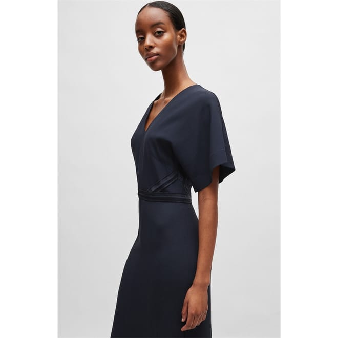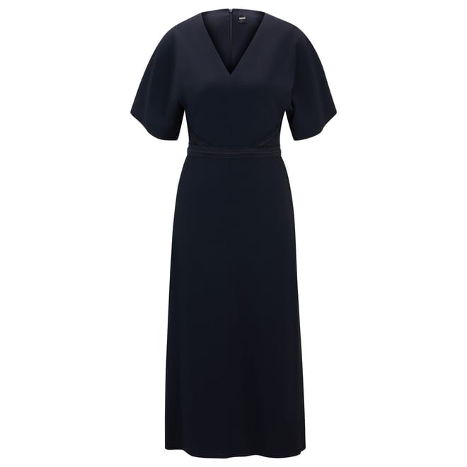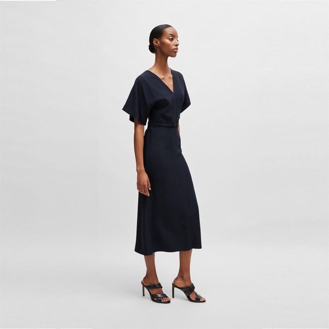 This Boss midi dress features a sophisticated A-line style with a V-neck and kimono short sleeves. The solid pattern adds a timeless touch, while the straight hemline ensures a clean finish. Perfect for those seeking a blend of elegance and simplicity. -