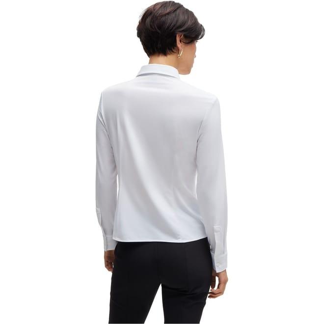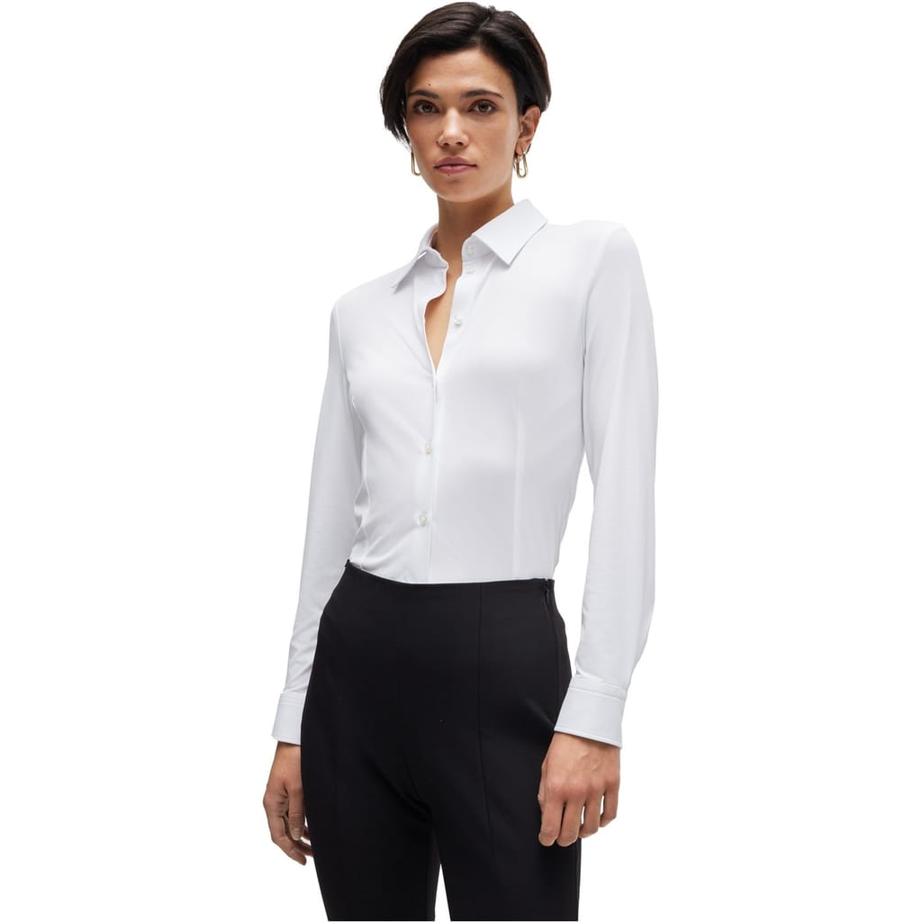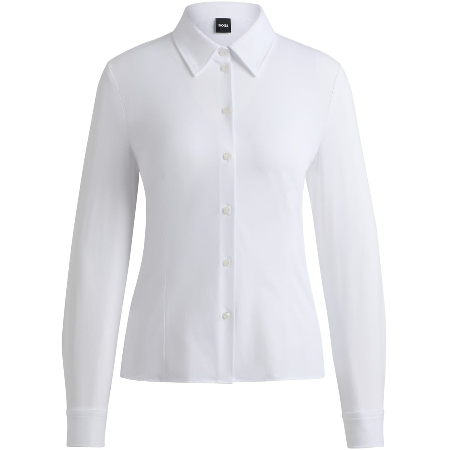 This Boss blouse is a sophisticated addition to any wardrobe. Designed in a dress shirt style, it features long sleeves with barrel cuffs and a shirt collar. The blouse is crafted for a regular fit with a button closure, ensuring both comfort and style. Perfect for formal occasions or office wear. -