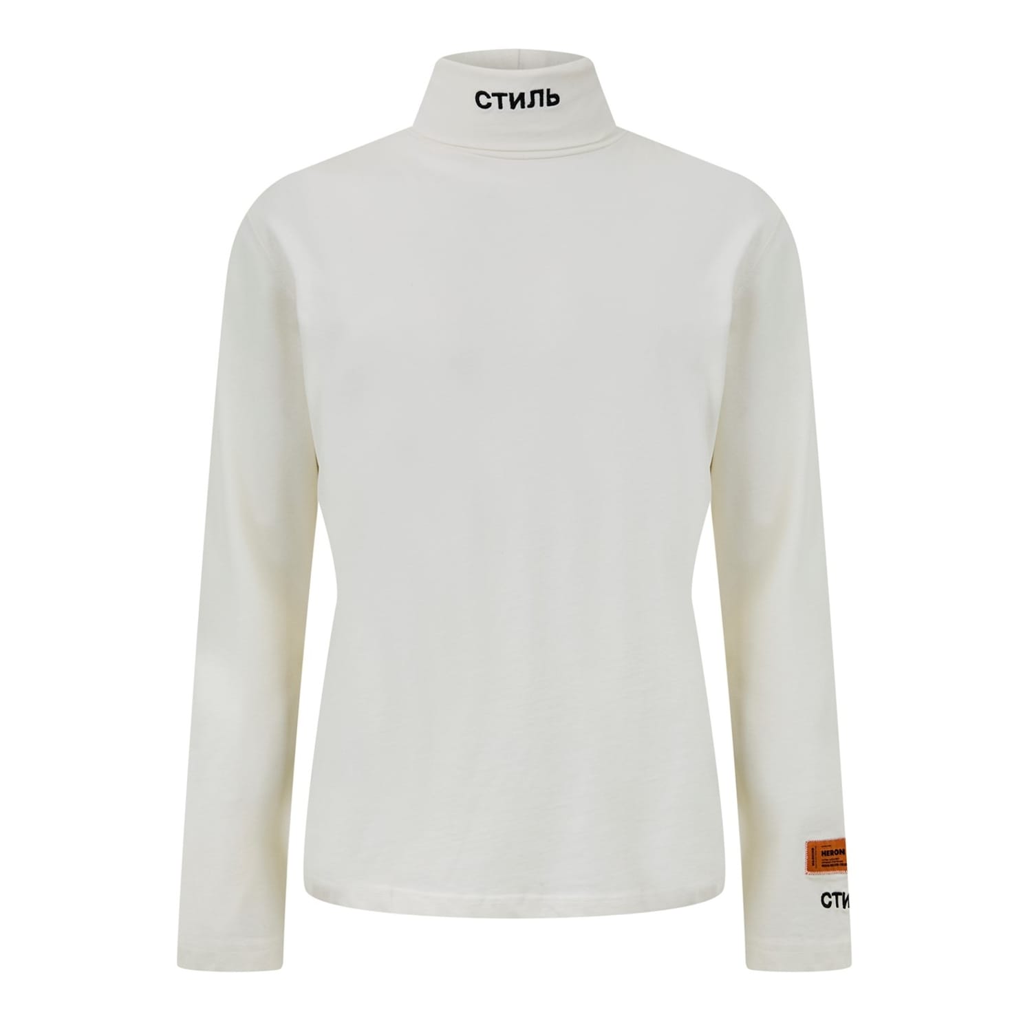 This Heron Preston top features a turtleneck design with a high collar, offering a regular fit. Crafted from knit material, it boasts long sleeves and a solid pattern. The top is adorned with a logo patch and embroidered embellishments, adding a distinctive touch to its design. -
