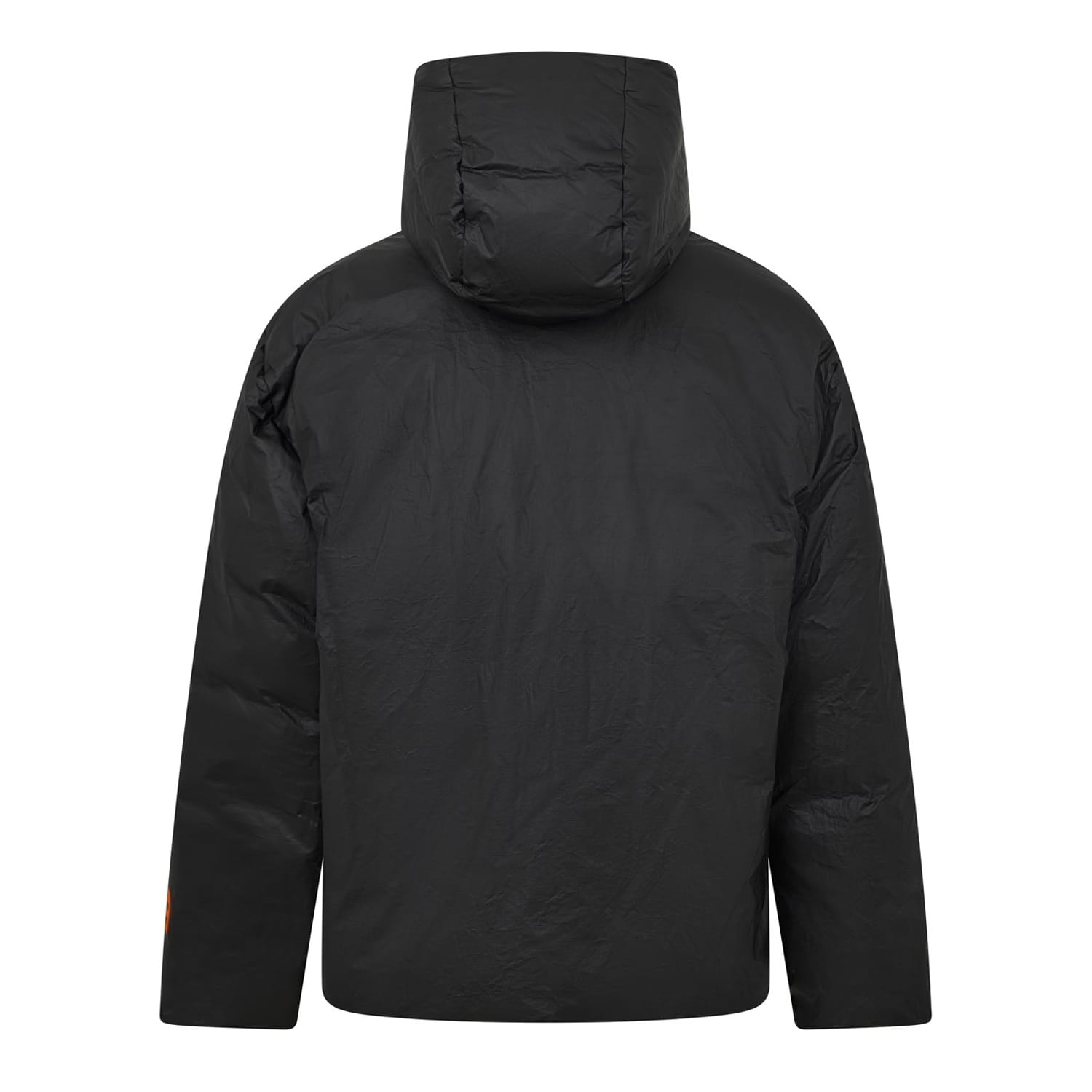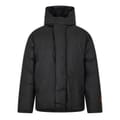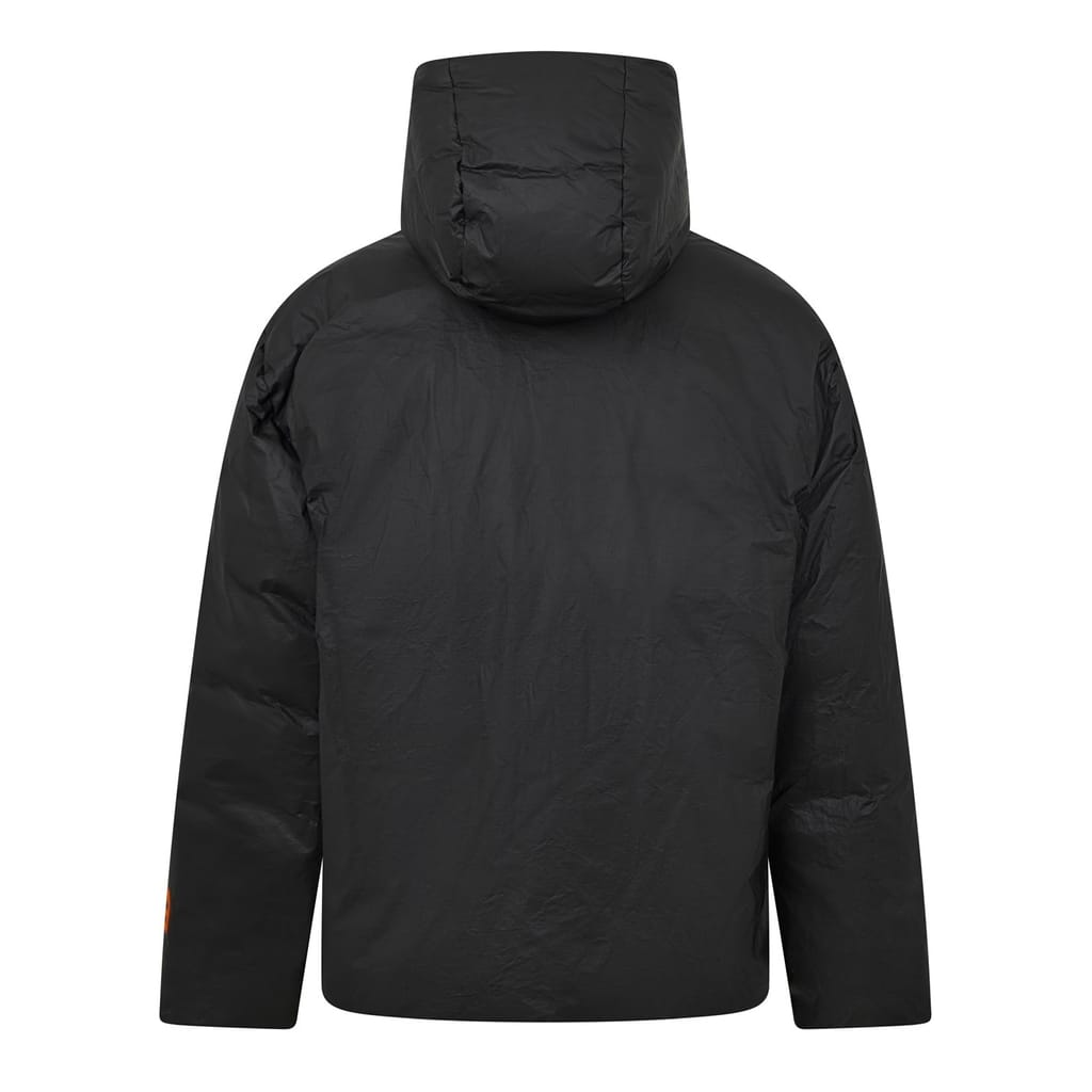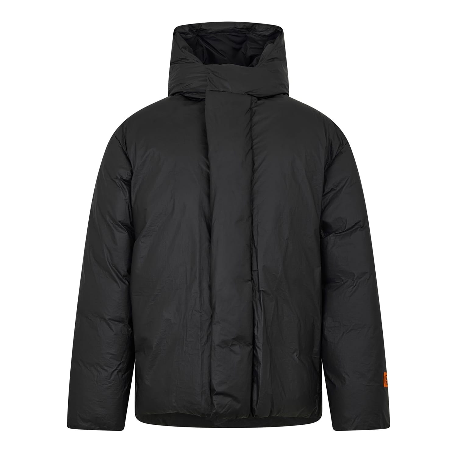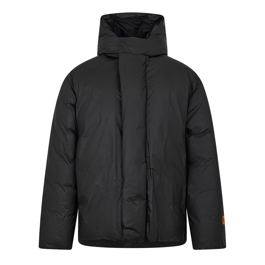 The Heron Preston down jacket epitomises style and functionality. Crafted in a solid puffer style, it features a high collar and hooded neckline for added warmth. The jacket's relaxed fit is complemented by elasticated cuffs and a secure zipper closure. A logo embellishment adds a subtle touch of branding, making it an essential addition to any wardrobe. -