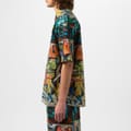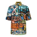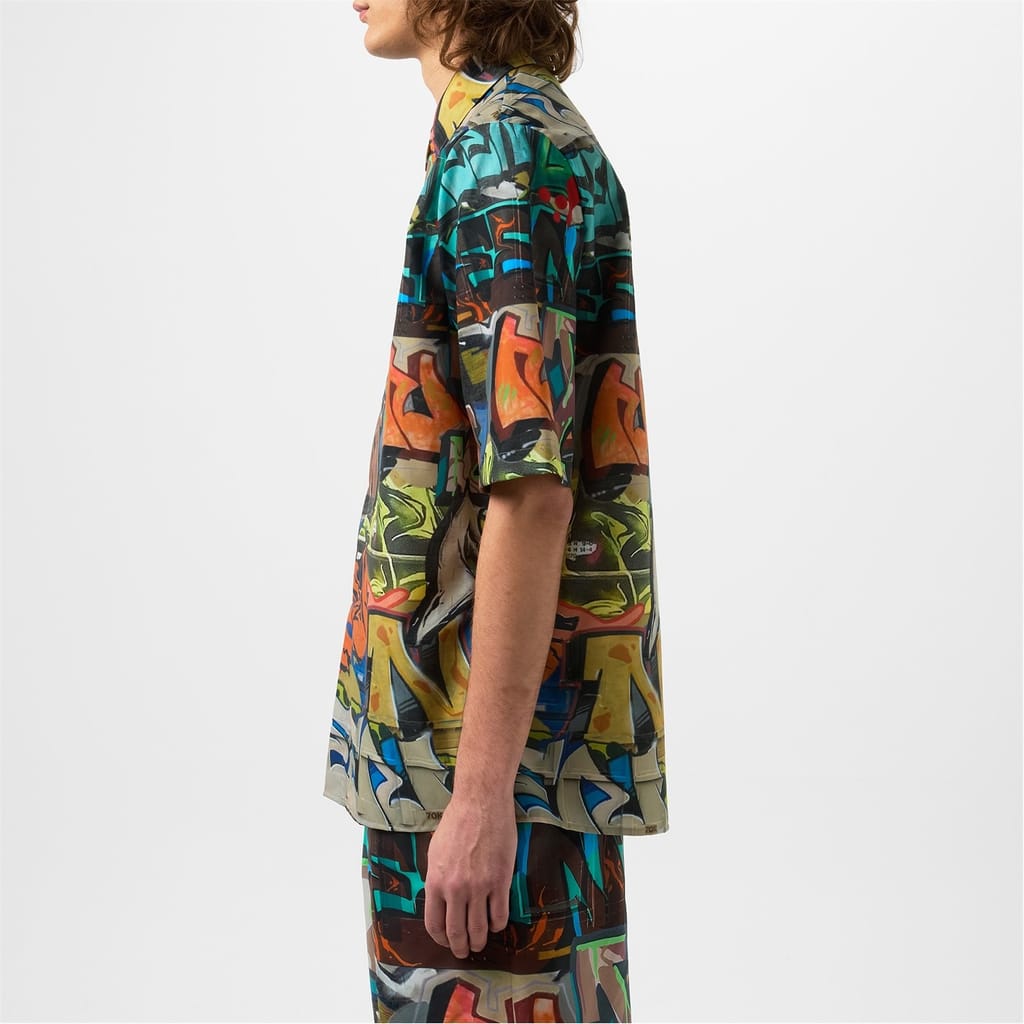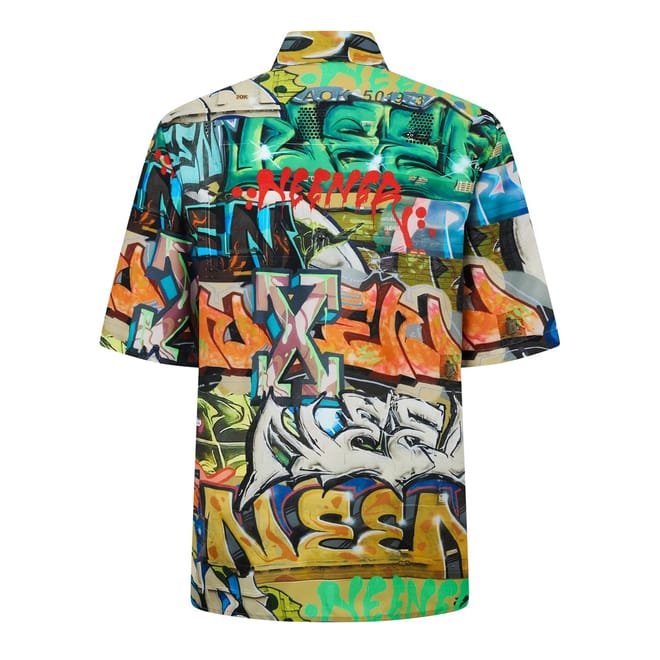 This Off White top features a graphic print and a button-down closure, offering a regular fit. The design is enhanced with a logo embellishment, adding a distinctive touch to the piece. -