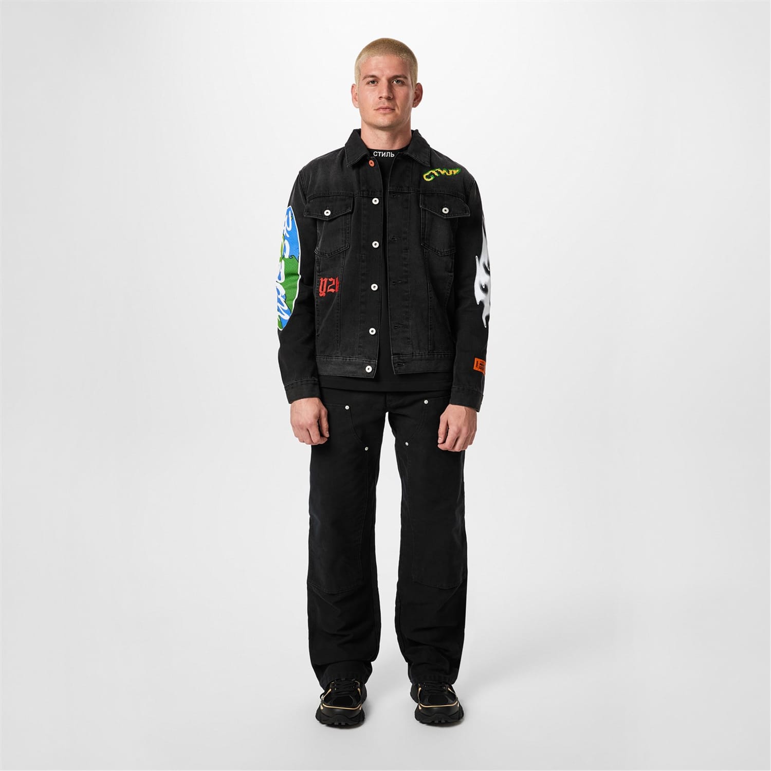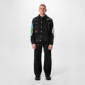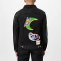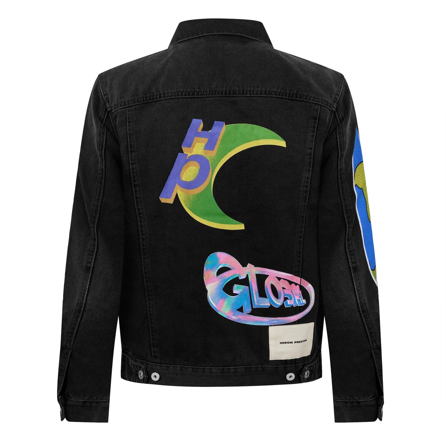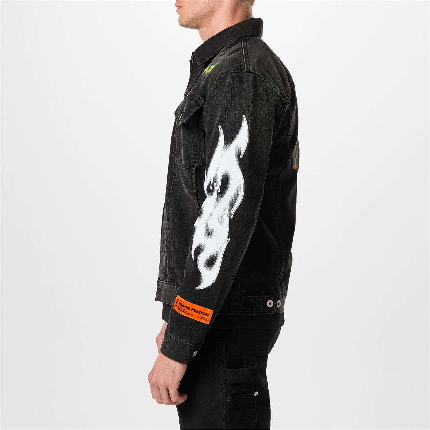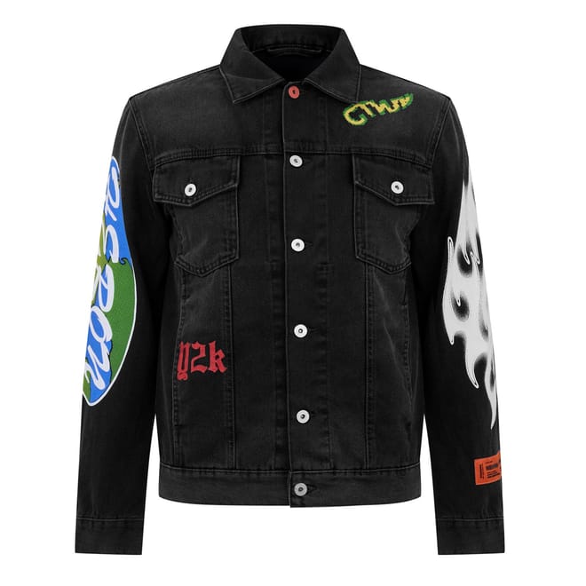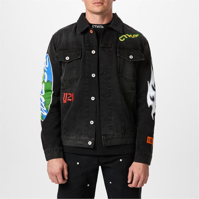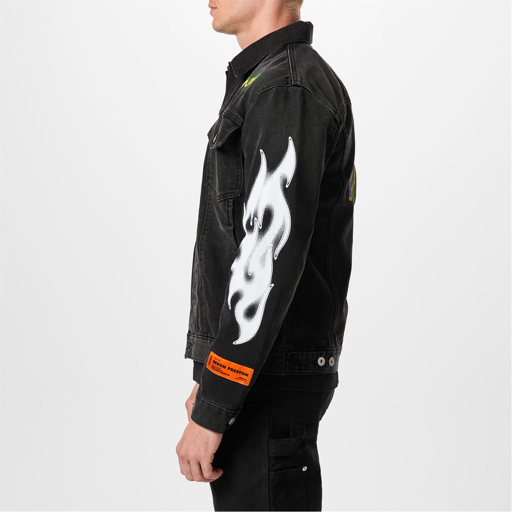 The Heron Preston denim jacket features a shirt collar and a button closure. This regular fit jacket is adorned with a distinctive graphic print, showcasing globe and flame embellishments. Perfect for adding a unique touch to any outfit. -