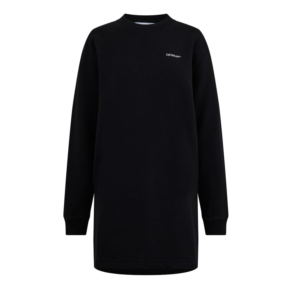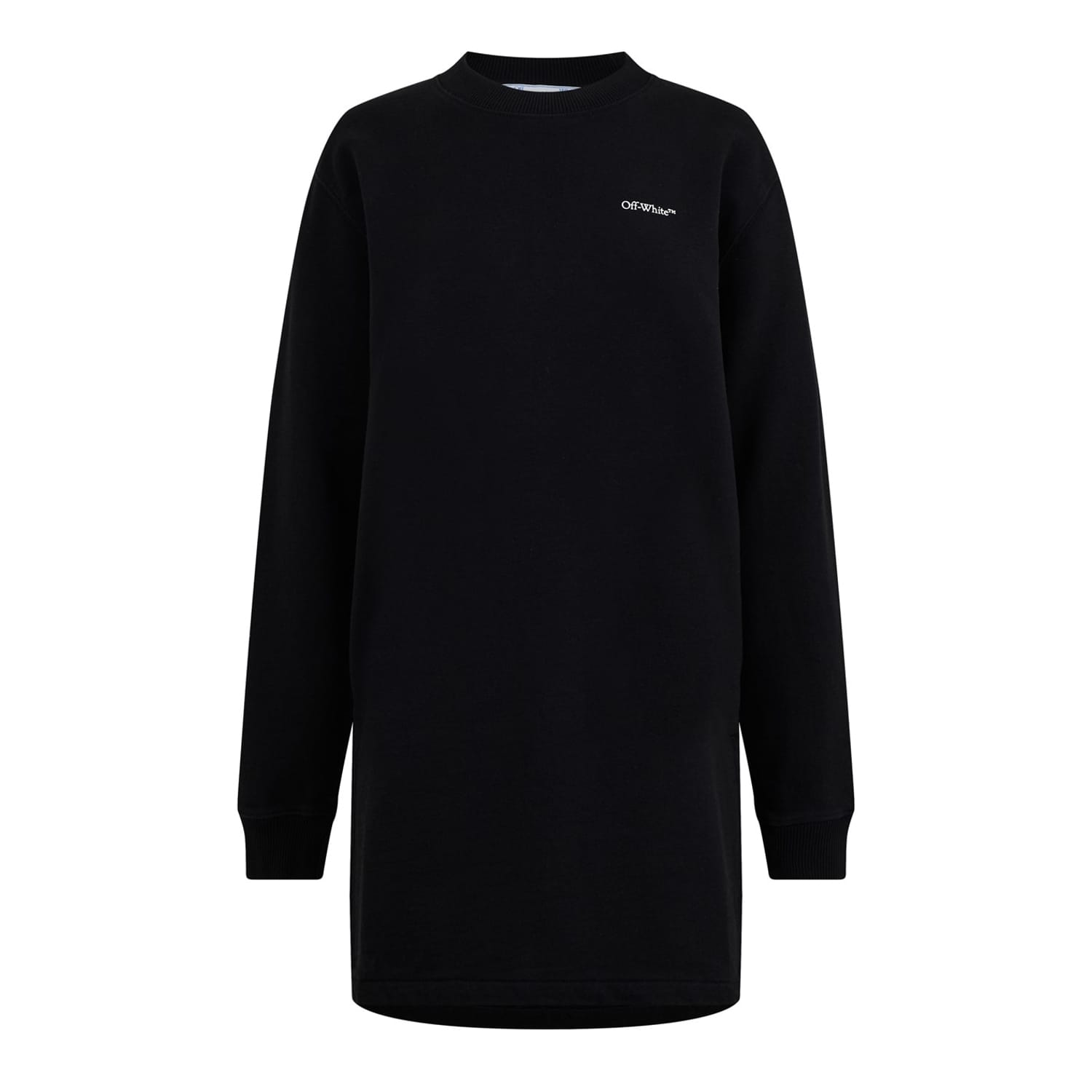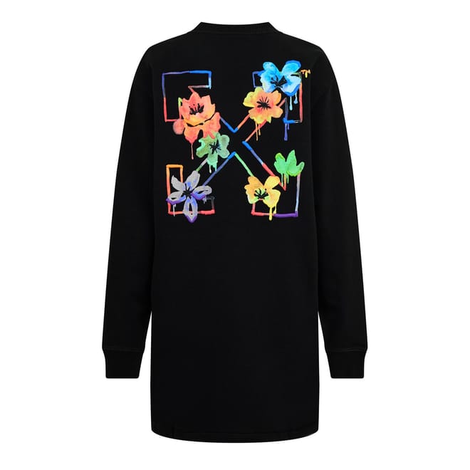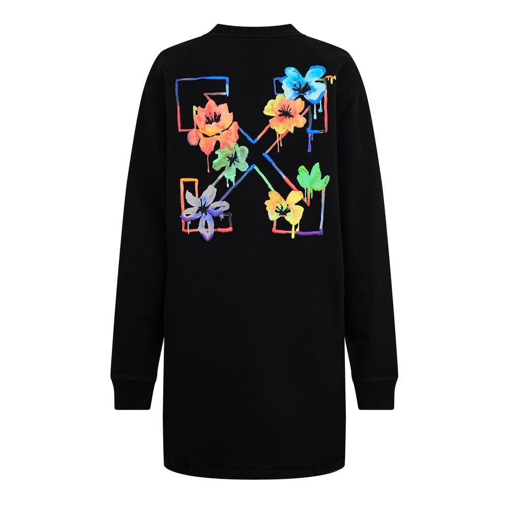 This Off-White knee-length floral dress combines the casual comfort of a sweatshirt style with a crew neck design. Featuring a straight hem and adorned with a logo, it offers a unique blend of style and brand identity. -