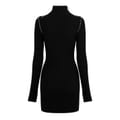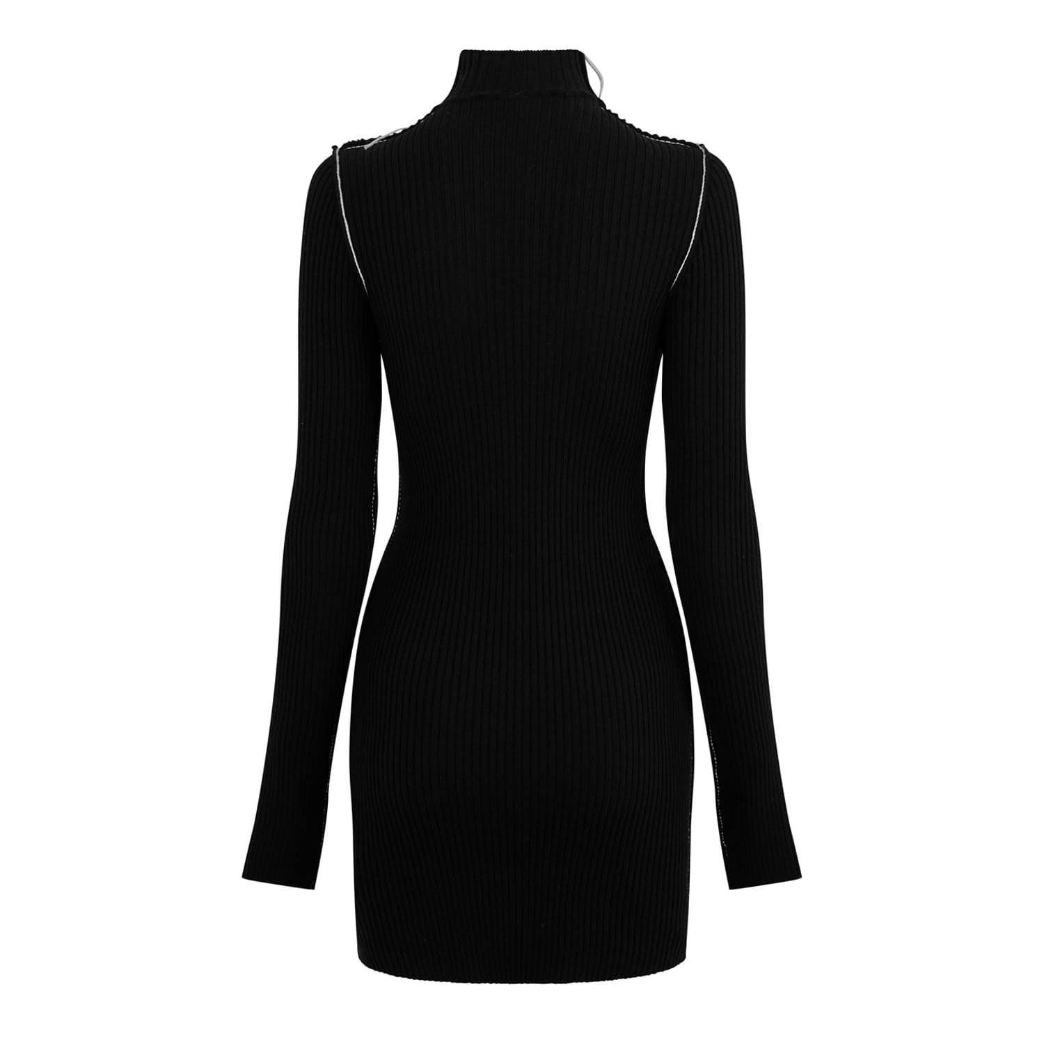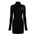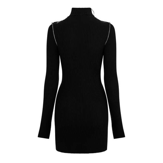 This Off-White mini dress is a striking bodycon piece, featuring a ribbed pattern and a turtleneck design. The slim fit accentuates the silhouette, while the logo and stitching embellishments add a distinctive touch. -