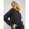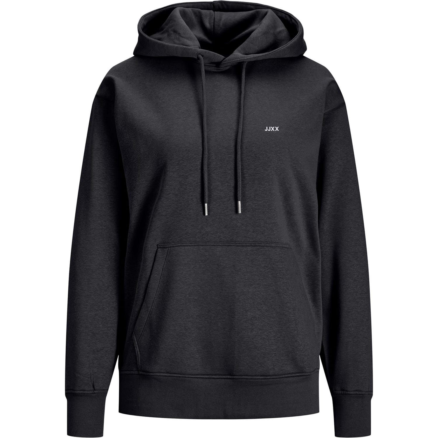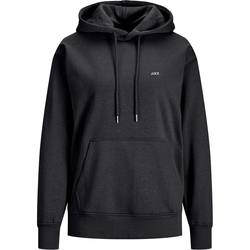The jjxx sweatshirt is a stylish hoodie with a hooded neckline and long sleeves. It features a drawstring closure and a regular fit for comfort. The ribbed cuffs add a touch of detail, while the kangaroo pocket enhances its functionality. A subtle logo embellishment completes the design, making it a versatile choice for everyday wear. -
