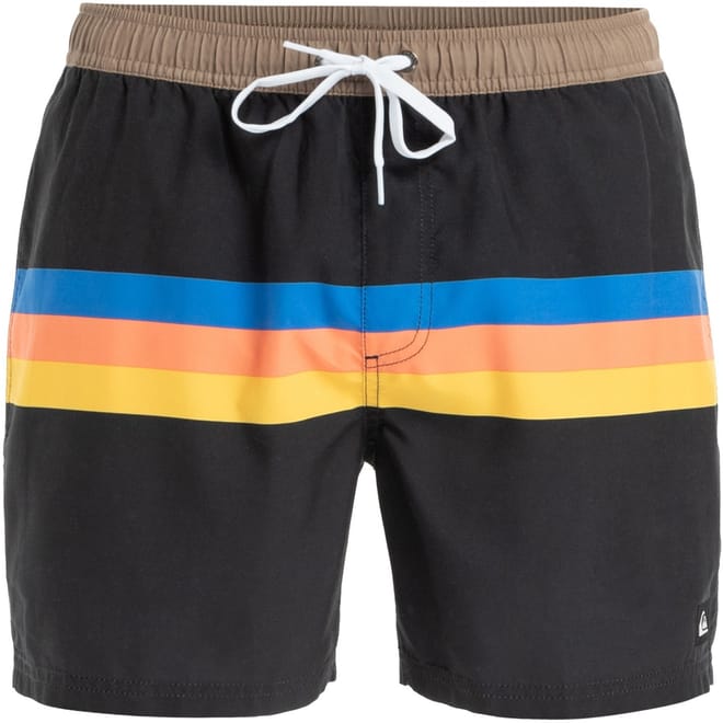 Quiksilver swimwear offers a stylish swim bottom perfect for beach and swimming activities. Featuring a classic stripe pattern, this piece includes a practical pocket and a secure drawstring closure, ensuring both functionality and style. -