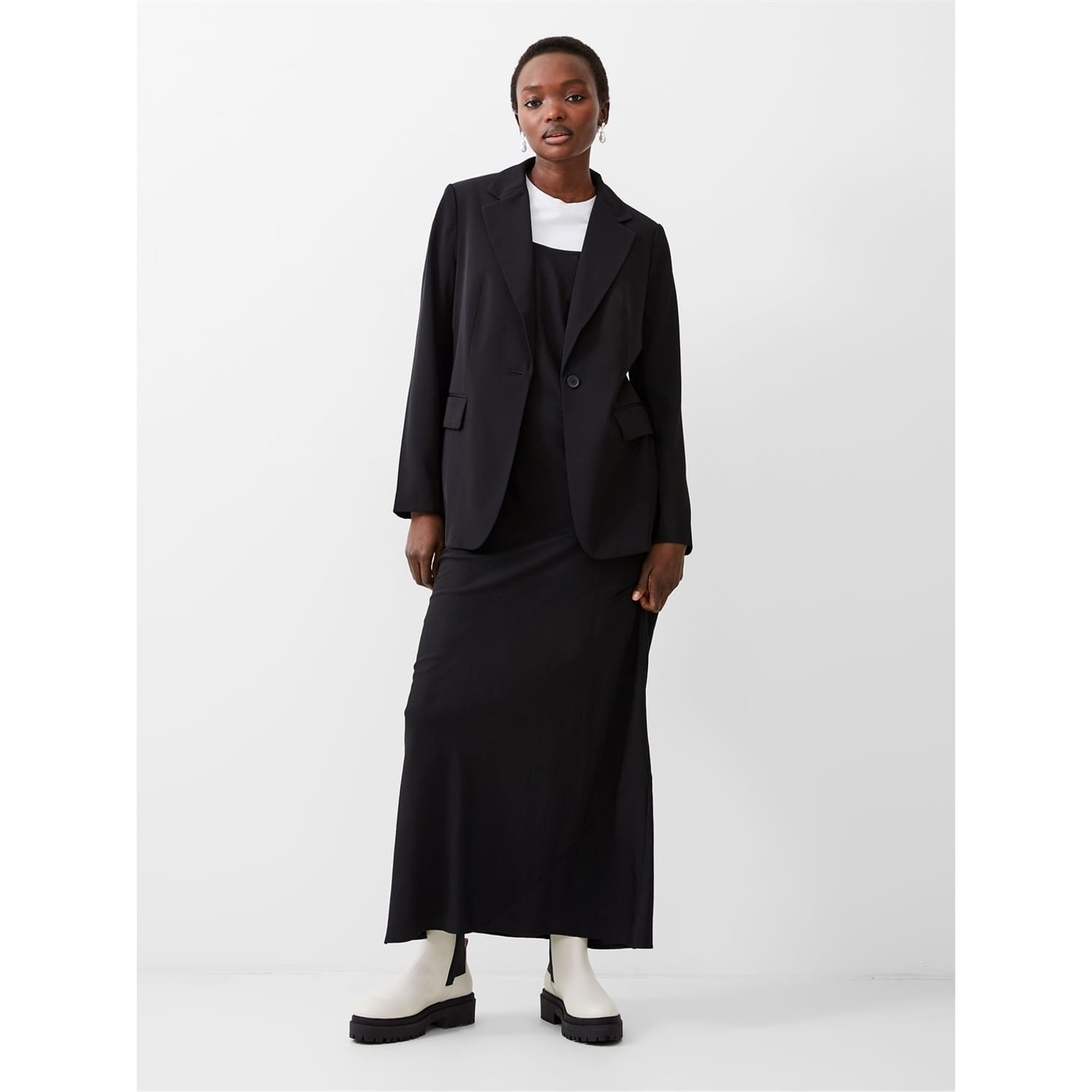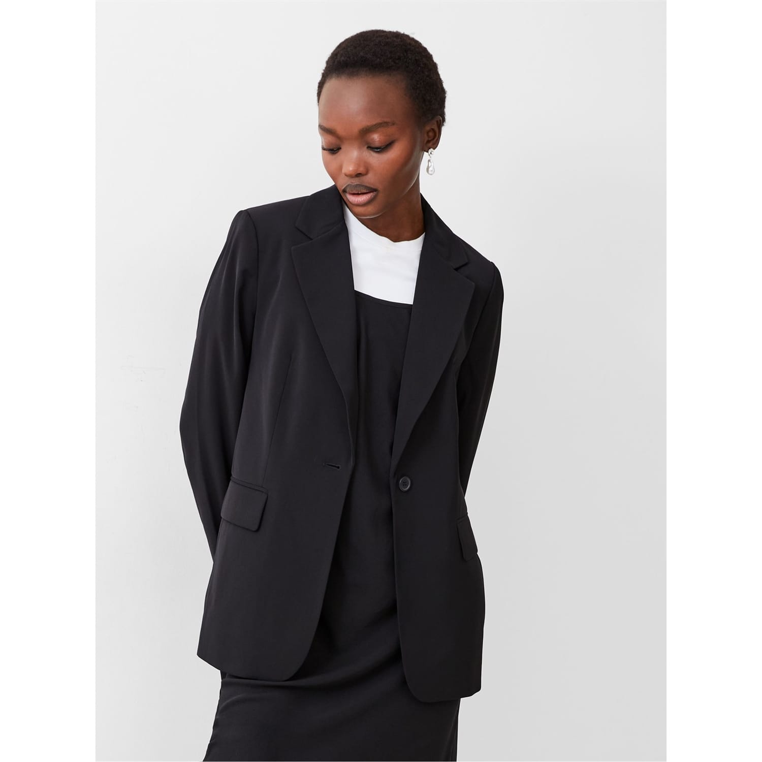 The French Connection blazer from the workwear collection is a solid, relaxed fit piece featuring a lapel collar and a straight hem. It includes a button closure and practical pockets, making it a versatile addition to your wardrobe. -