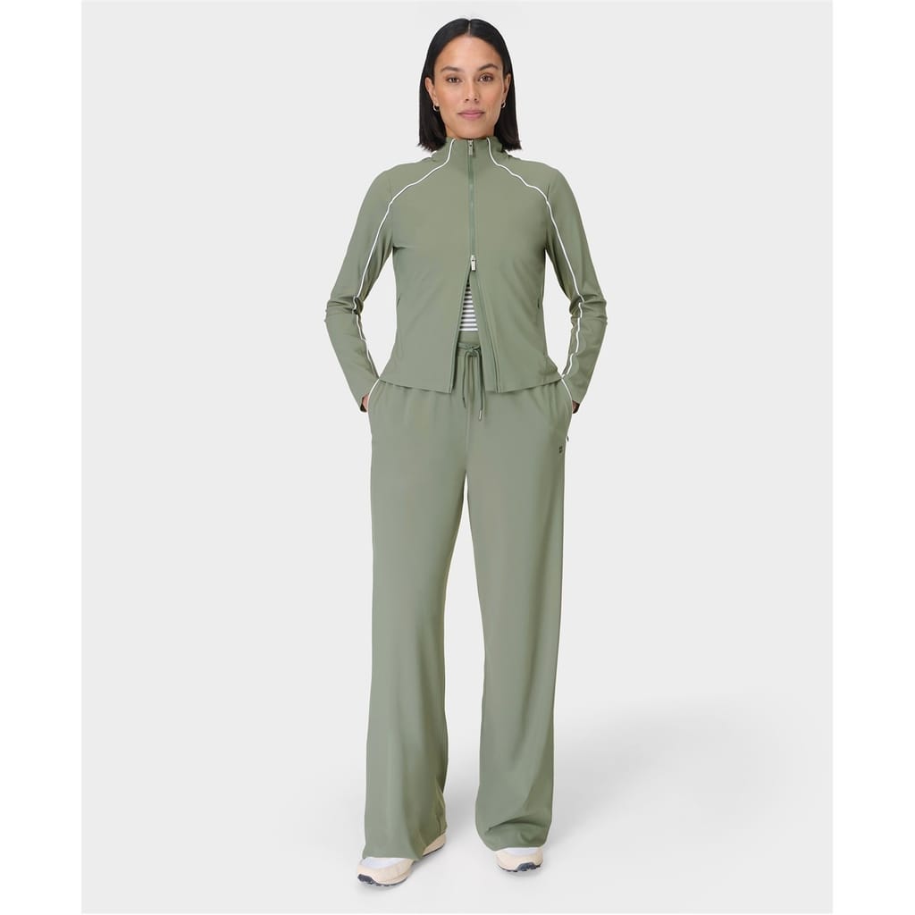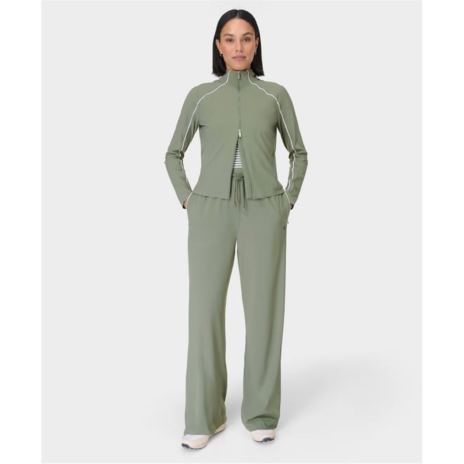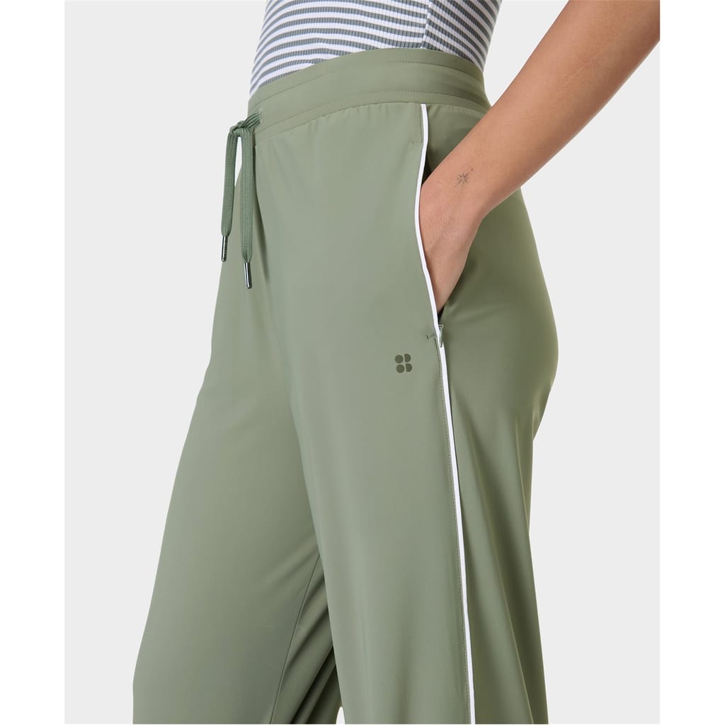 Discover the Sweaty Betty wide-leg trousers, designed for both style and comfort. These pants feature a practical drawstring closure and are adorned with pockets for added functionality. The subtle logo embellishment adds a touch of brand identity, making these trousers a versatile addition to your wardrobe. -