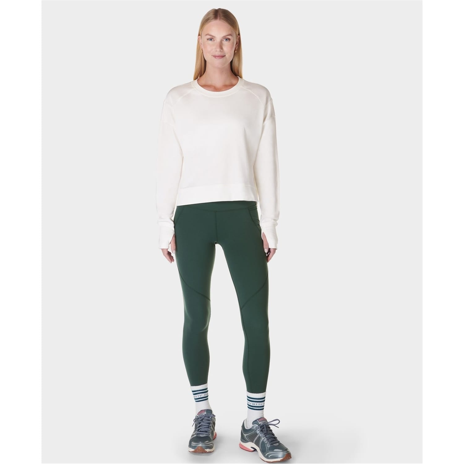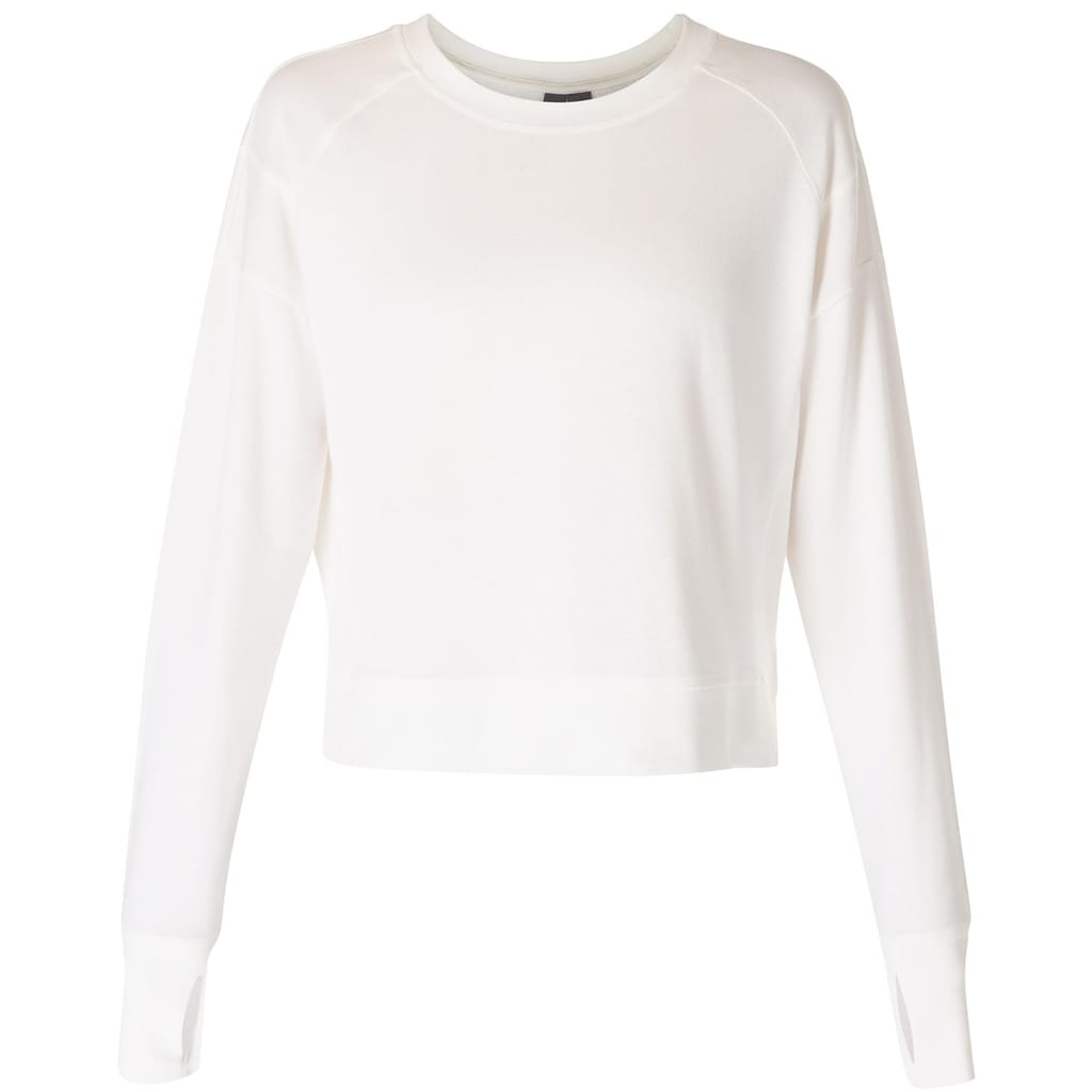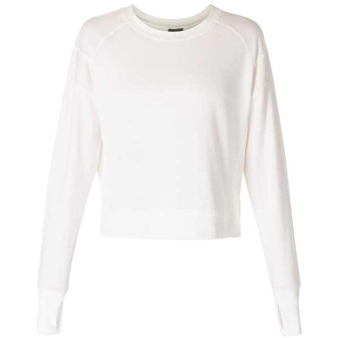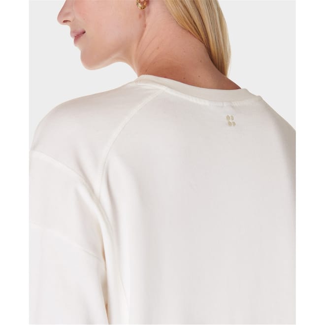 This Sweaty Betty cropped top features a relaxed fit with long raglan sleeves and a crew neck. The solid pattern is complemented by a subtle logo embellishment, adding a touch of brand identity. Ribbed cuffs enhance the overall design, making it a versatile addition to your wardrobe. -
