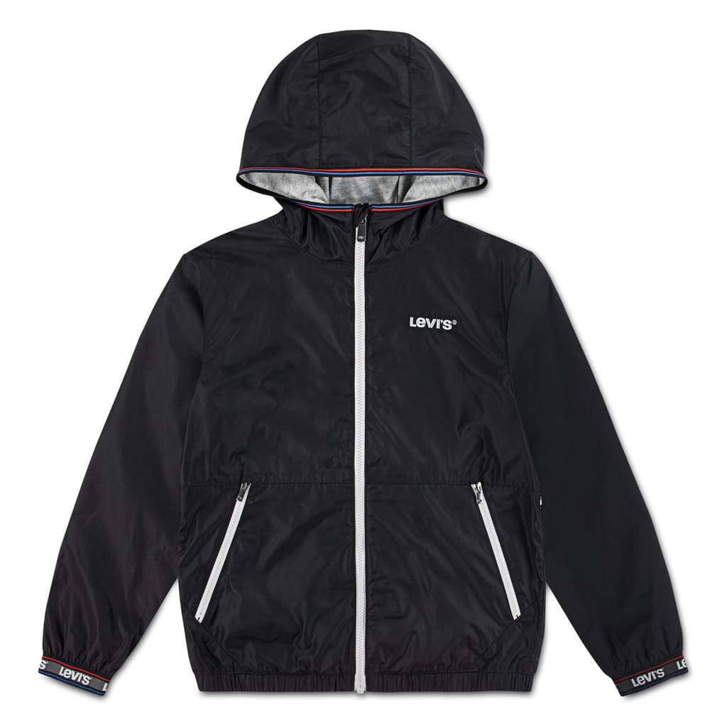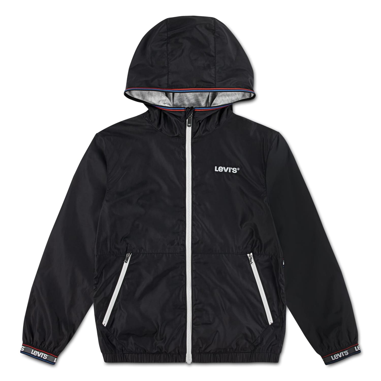 This Levi's junior windbreaker jacket features a hooded neckline and a regular fit, perfect for a stylish yet functional look. The jacket is designed with a solid pattern and includes a zipper closure for easy wear. It boasts a straight hem and ribbed cuffs, along with practical zipped pockets. The jacket is embellished with the iconic Levi's logo and lettering, adding a touch of brand identity. -