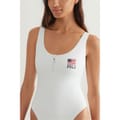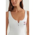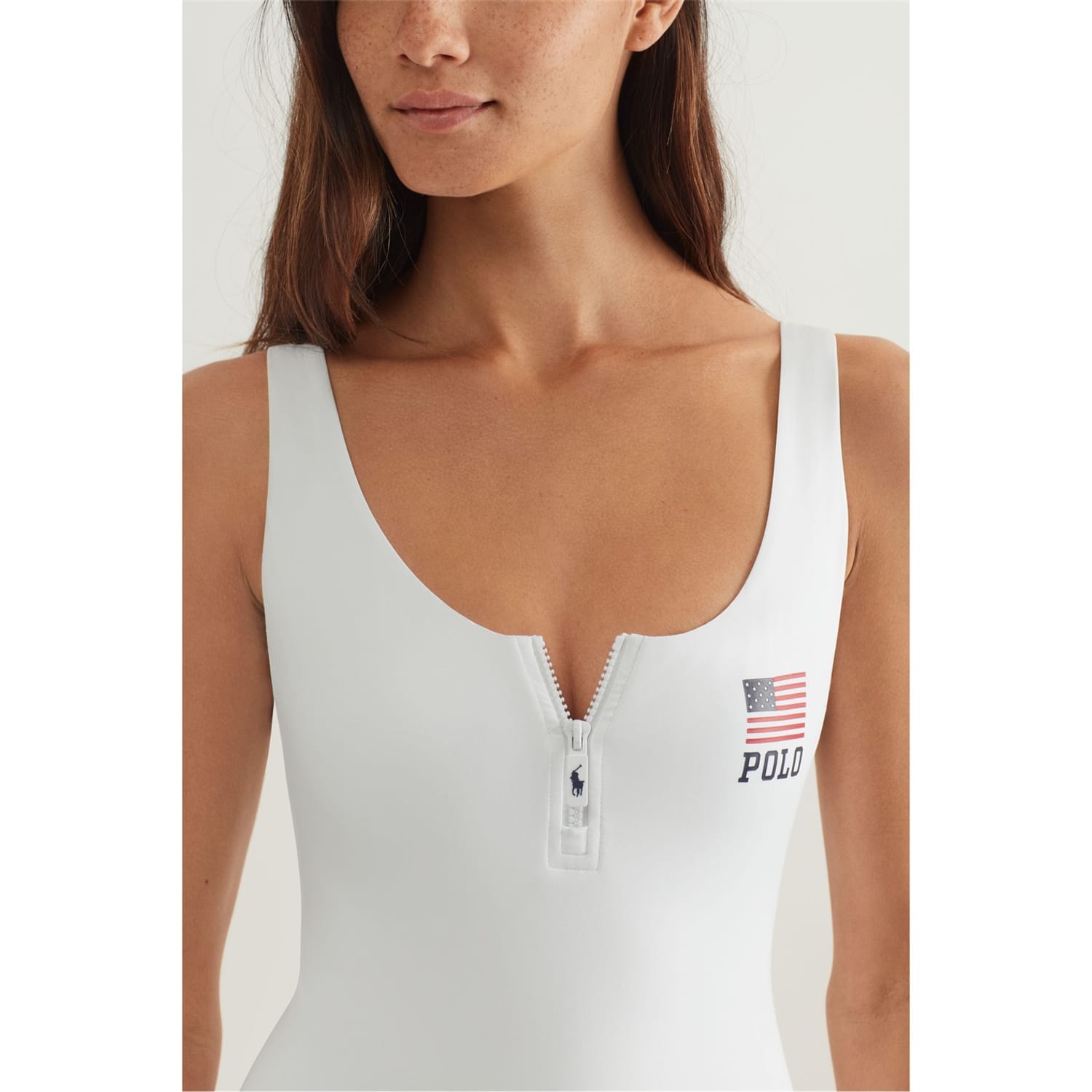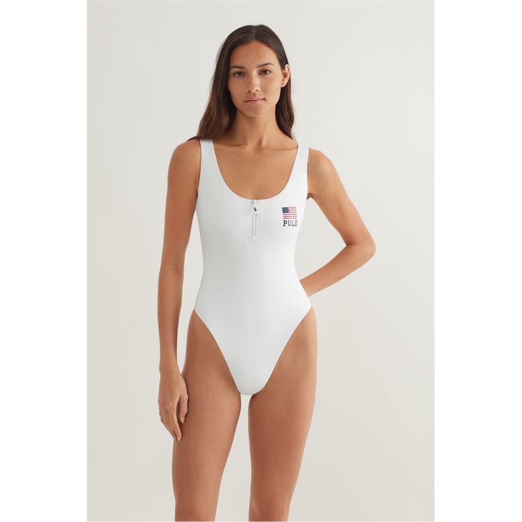 Discover the Polo Ralph Lauren one-piece swimwear, featuring a sleek zipper closure for ease and style. This swimwear is elegantly adorned with the iconic logo, adding a touch of sophistication to your beach or poolside look. -