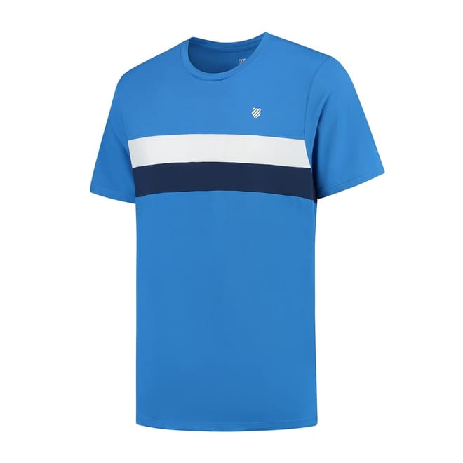 Elevate your training sessions with this K-Swiss stripe t-shirt, crafted for performance. Featuring a crew neck and short sleeves, it offers a regular fit for comfort. Embellished with a logo, the ribbed collar adds a touch of style to this athletic top, making it an ideal choice for your active wardrobe. -