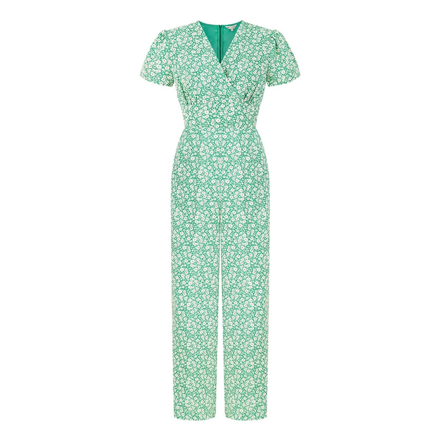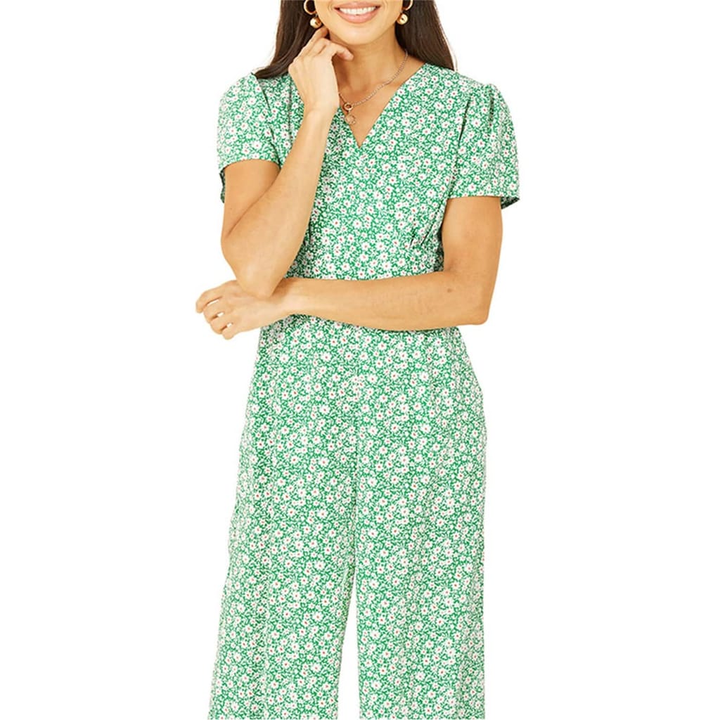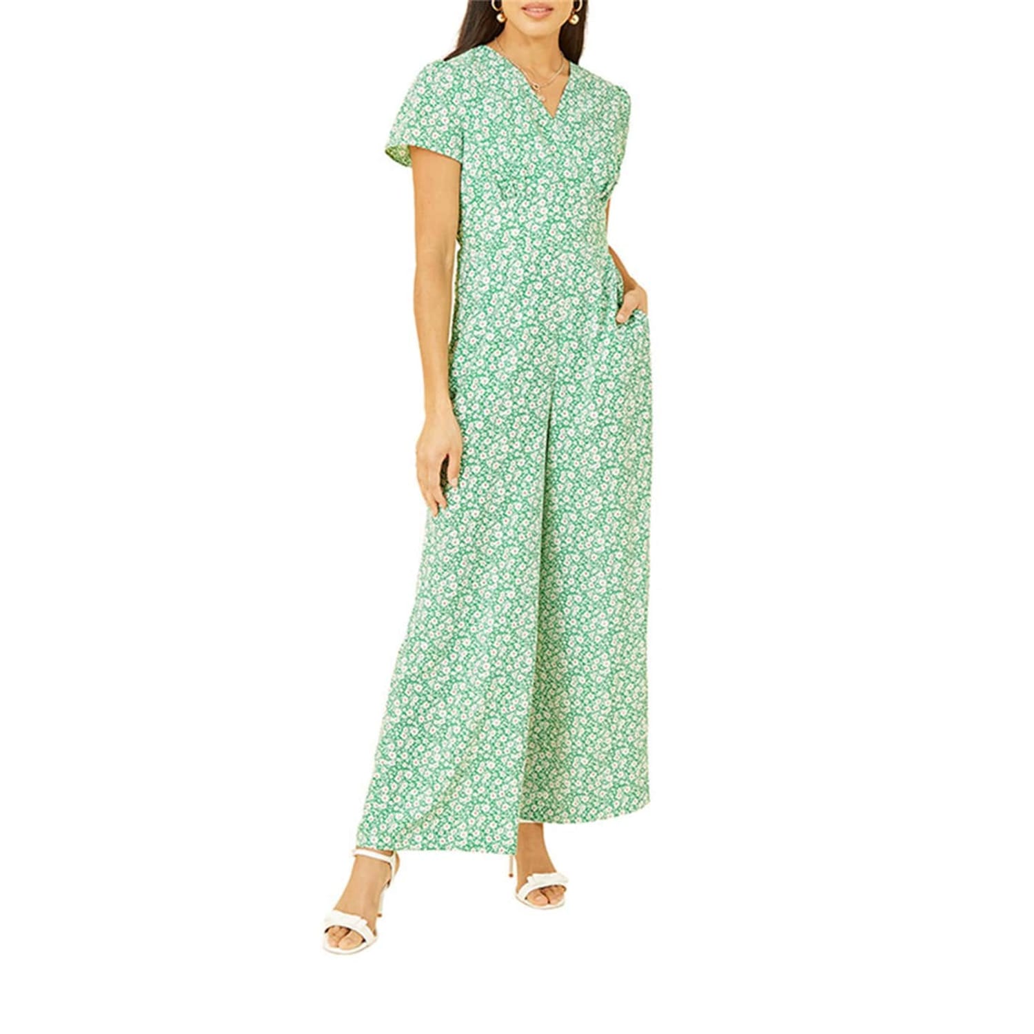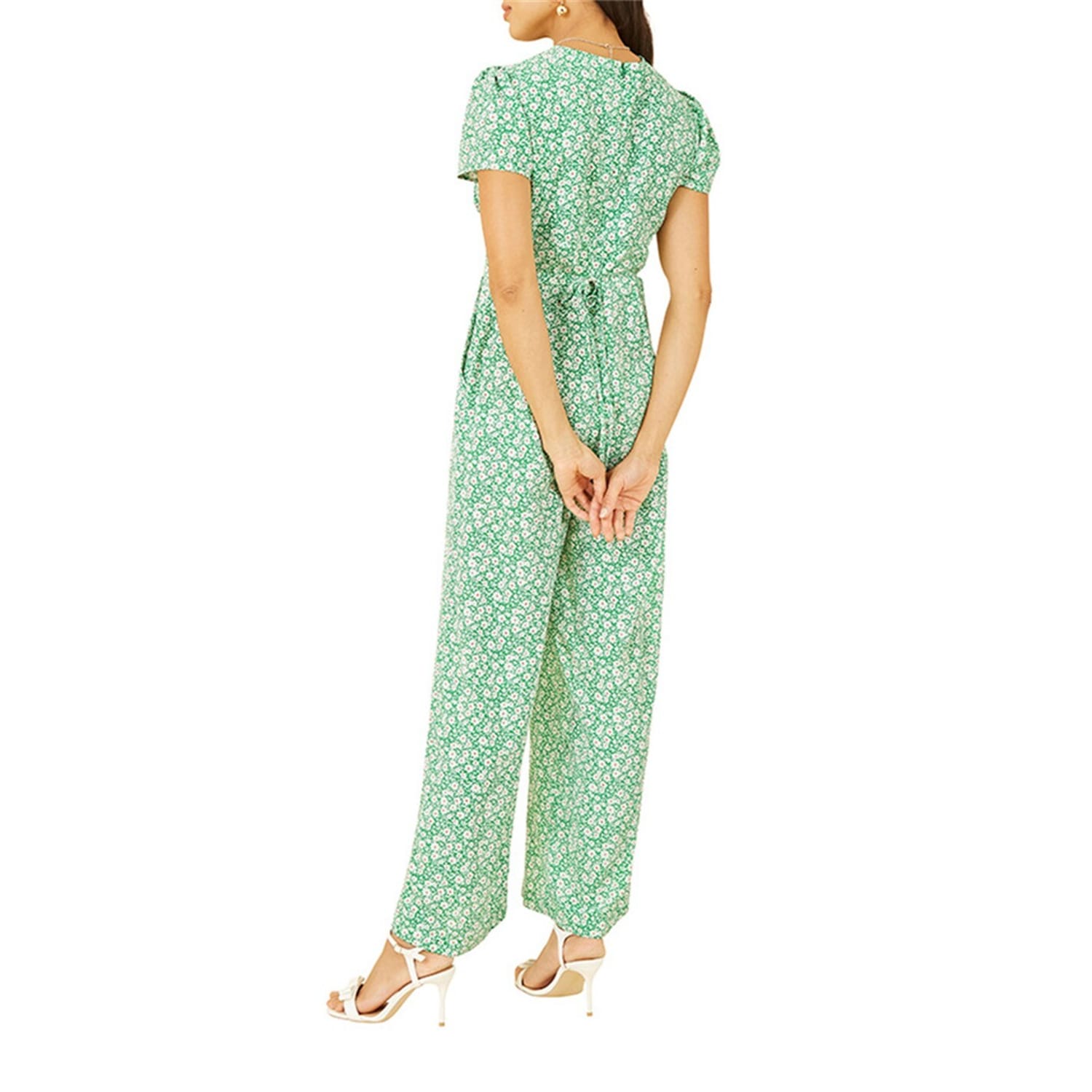 Discover the Yumi floral wrap jumpsuit, featuring a V-Neck and short plain sleeves. This relaxed fit design is adorned with practical pockets, offering both style and functionality. -