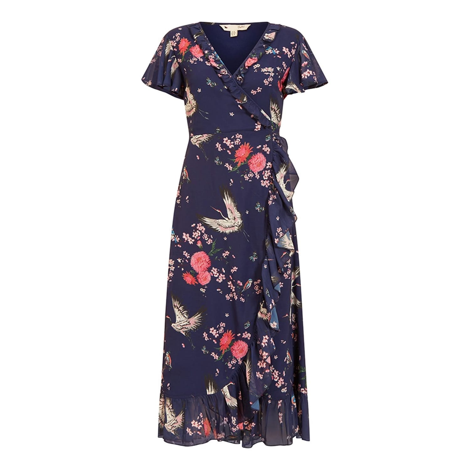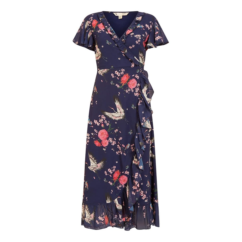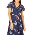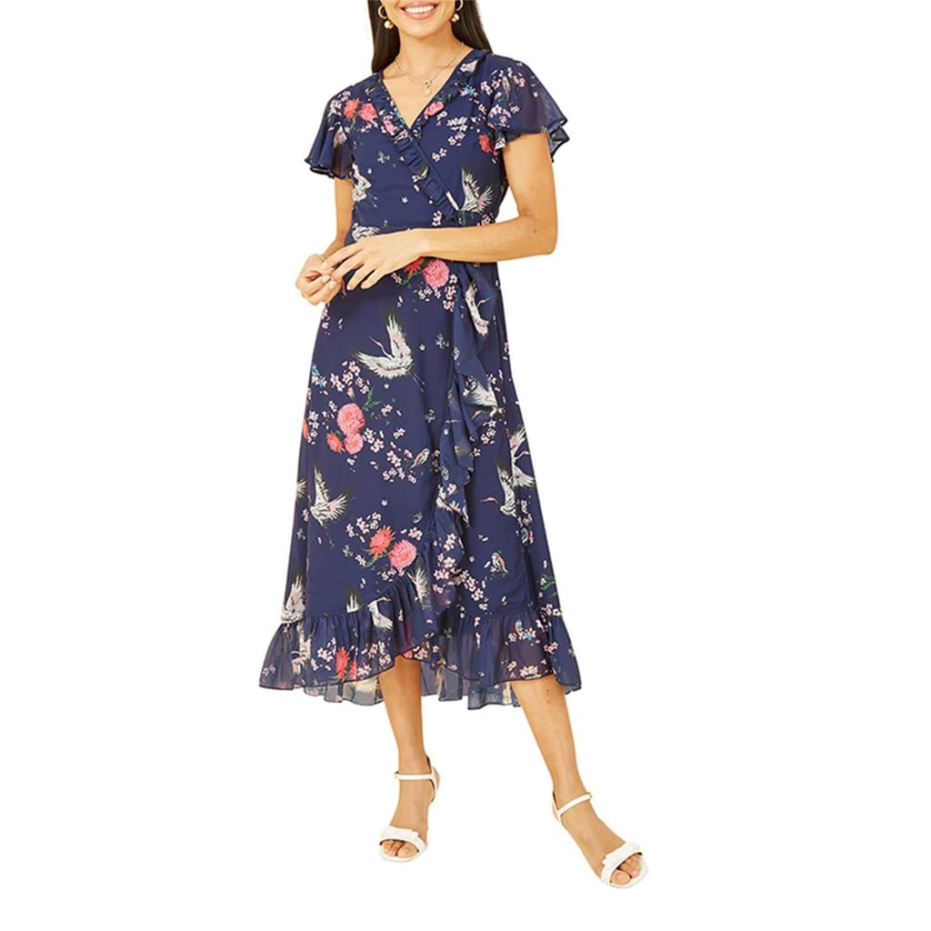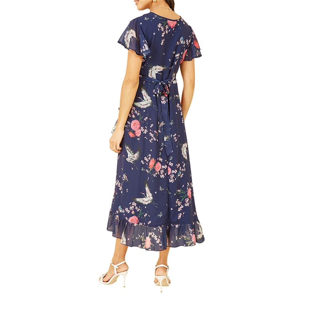 This Yumi wrap dress features a charming floral print, perfect for any occasion. The midi length and V-neck design offer a flattering silhouette, while the short flutter sleeves add a touch of elegance. A tie waist closure ensures a comfortable fit, and the ruffle hemline provides a playful finish. Ideal for those who appreciate style and comfort in one. -