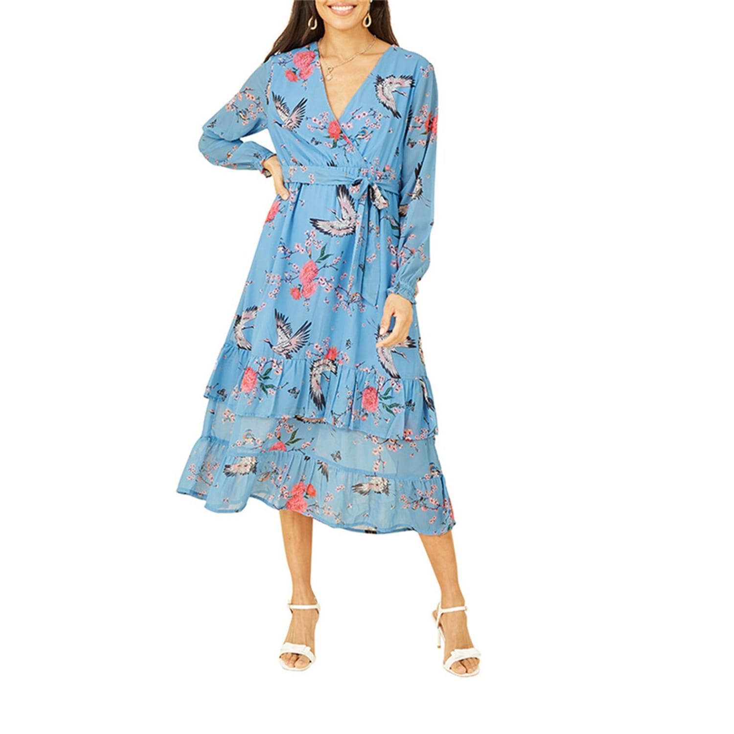 This Yumi wrap dress features a charming floral print, perfect for any occasion. The midi length and ruffle hem add a touch of elegance, while the V-neckline and puff sleeves provide a stylish silhouette. The tie waist closure ensures a flattering fit, and the ruffle embellishments enhance its feminine appeal. -