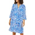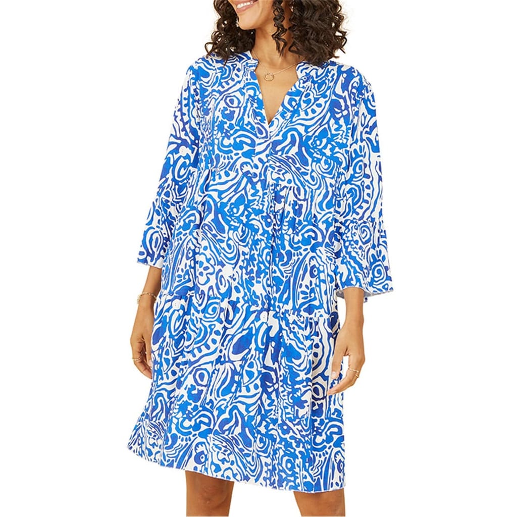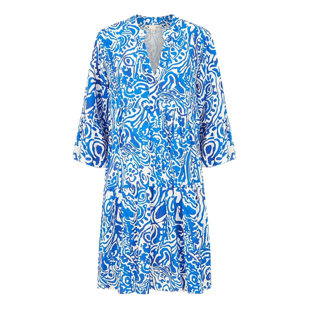 Discover the Yumi wrap dress, a stylish knee-length piece featuring an abstract pattern. This dress is designed with a flattering V-neck and three-quarter sleeves, offering a chic and modern look. Perfect for various occasions, it combines elegance with comfort, making it a versatile addition to your wardrobe. -