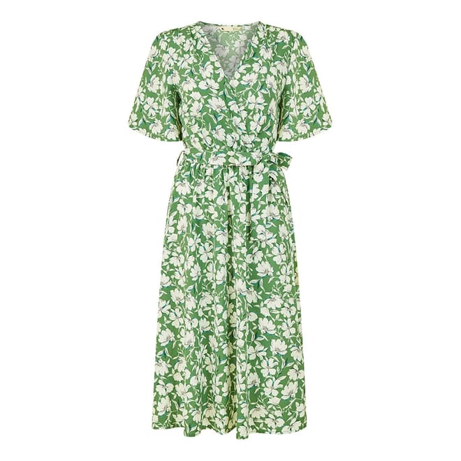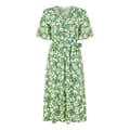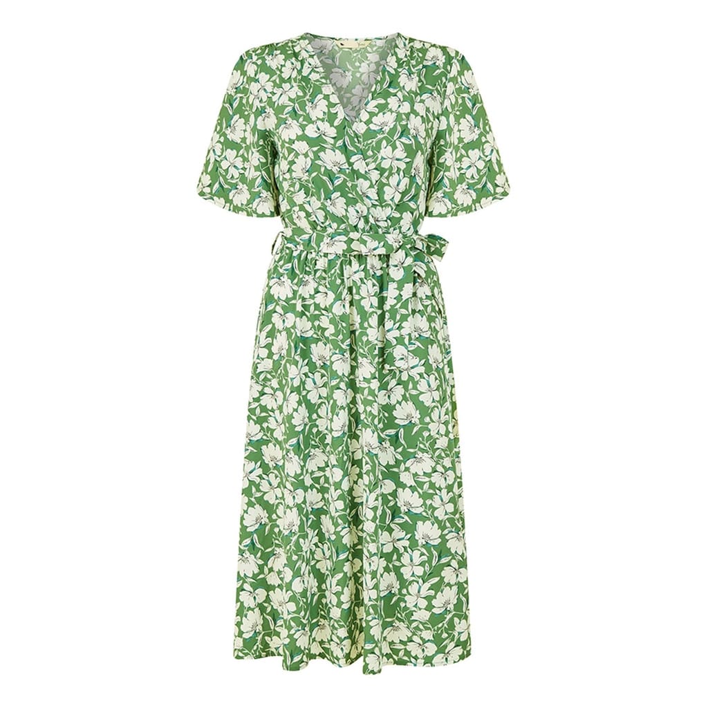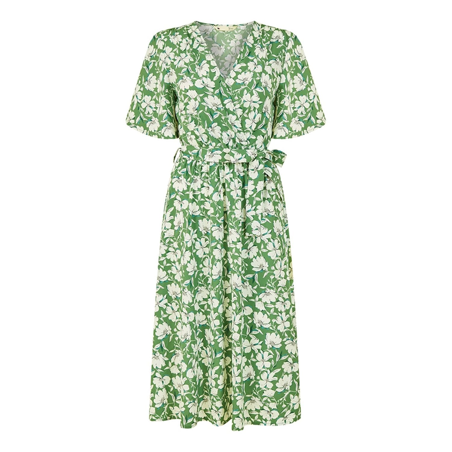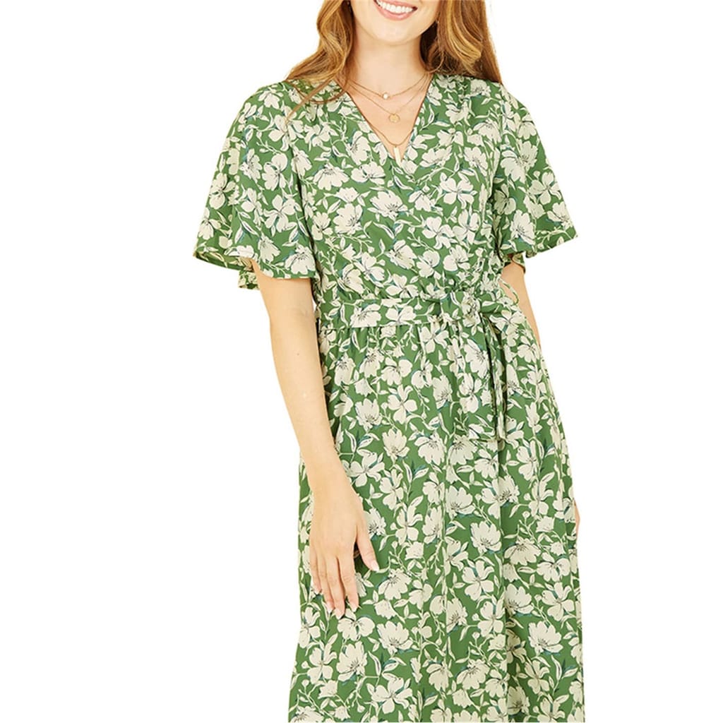 Discover the elegance of Yumi's wrap midi dress, featuring a charming floral pattern. This dress boasts a flattering V-neck and short flutter sleeves, adding a touch of sophistication. The tie waist closure ensures a perfect fit, making it a versatile addition to your wardrobe. -