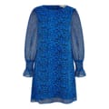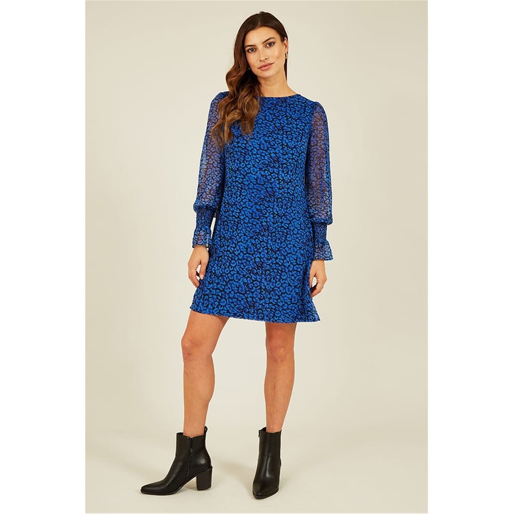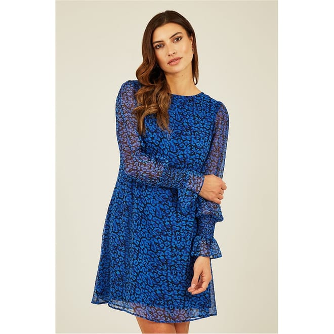 This Yumi mini dress features an eye-catching animal pattern, perfect for making a statement. The tunic style is complemented by a crew neck and long bishop sleeves, adding a touch of elegance. Ruffle embellishments enhance the overall design, making it a versatile choice for various occasions. -