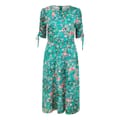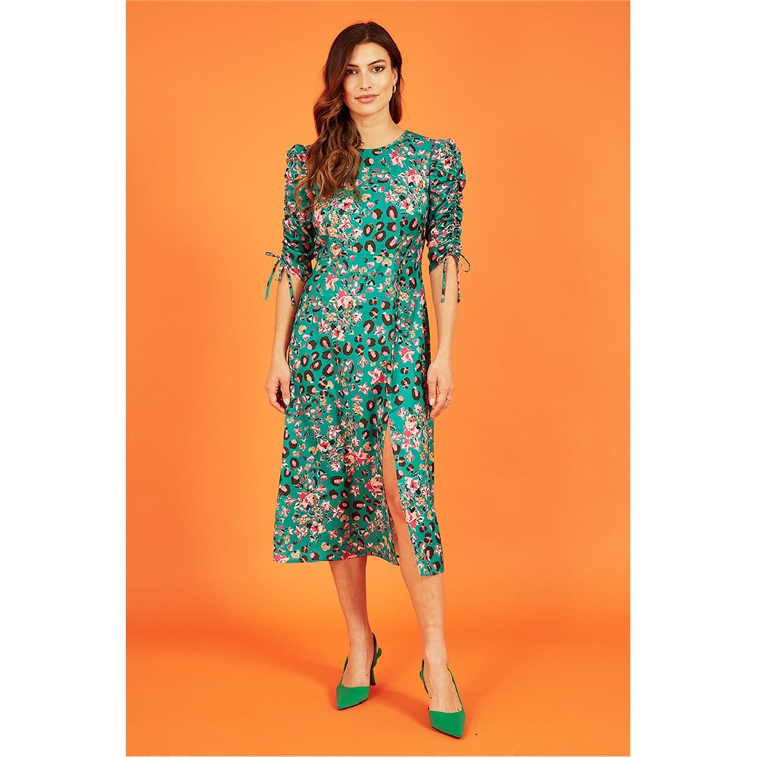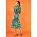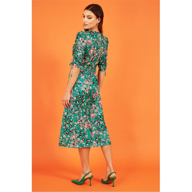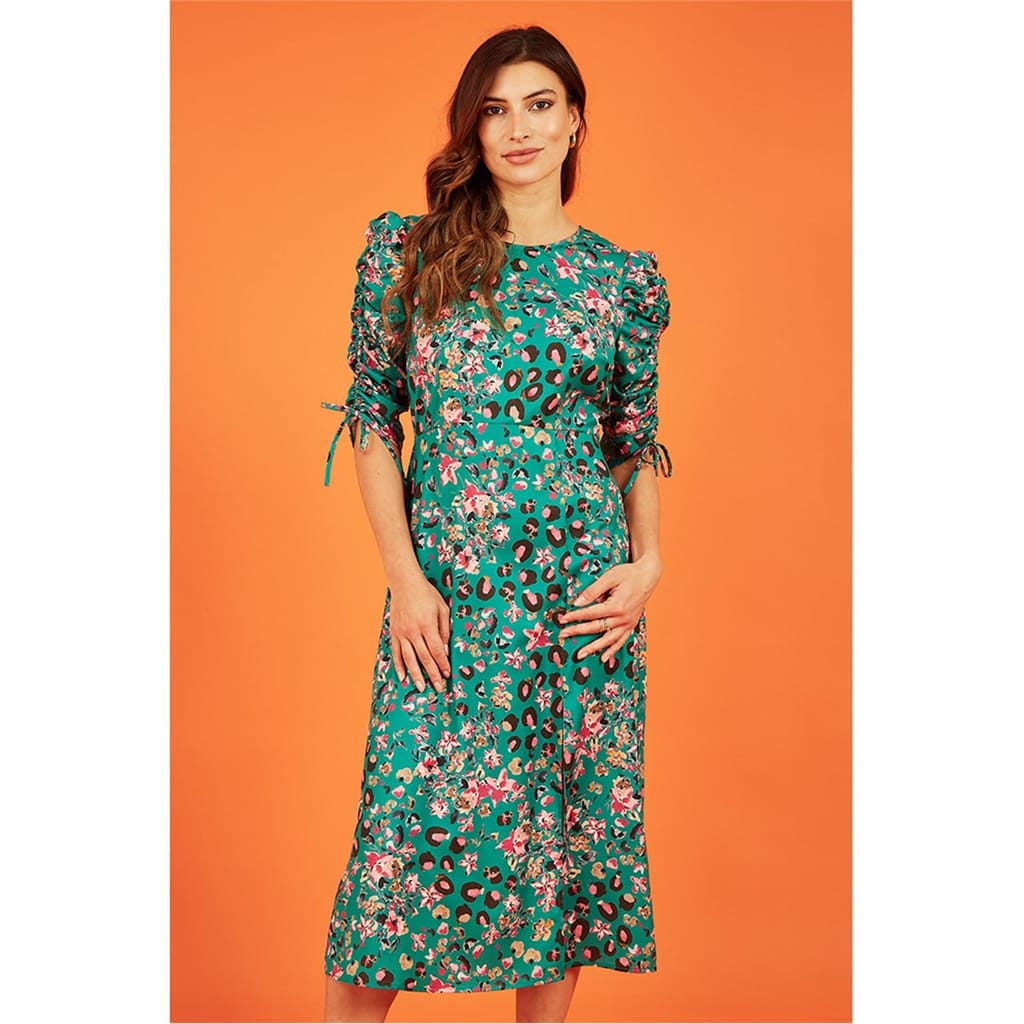 This Yumi midi dress combines a floral and animal print for a striking look. Featuring a smocked embellishment, it offers a unique texture. The dress is designed in an A-line style with a crew neck and three-quarter puff sleeves, providing a blend of comfort and elegance. -