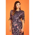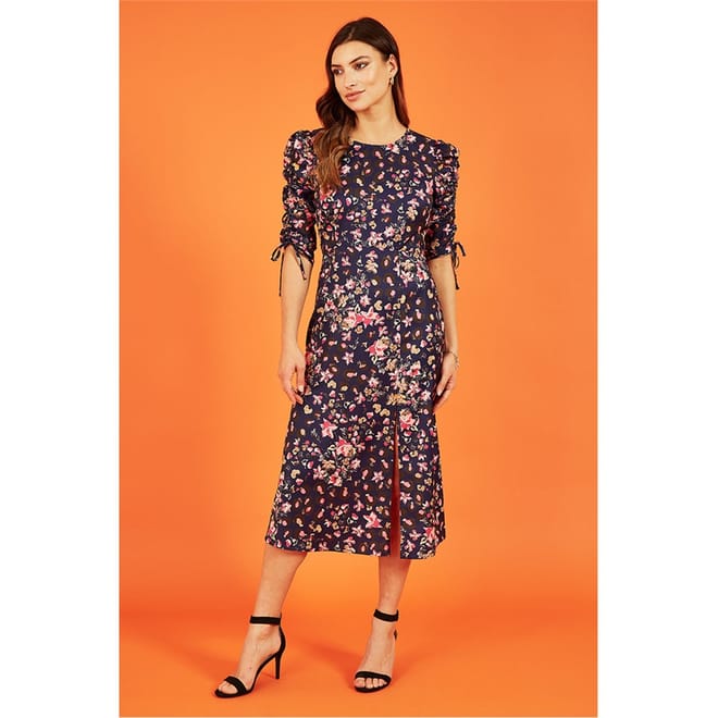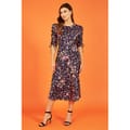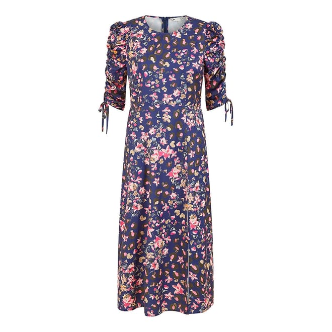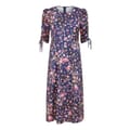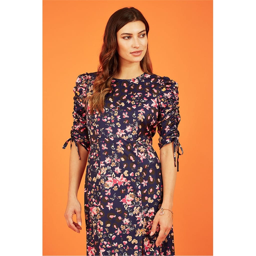 Discover the Yumi midi dress, a perfect blend of floral and animal prints. This A-line dress features a crew neck and three-quarter puff sleeves, adding a touch of elegance. The smocked embellishment enhances its casual charm, making it a versatile choice for various occasions. -
