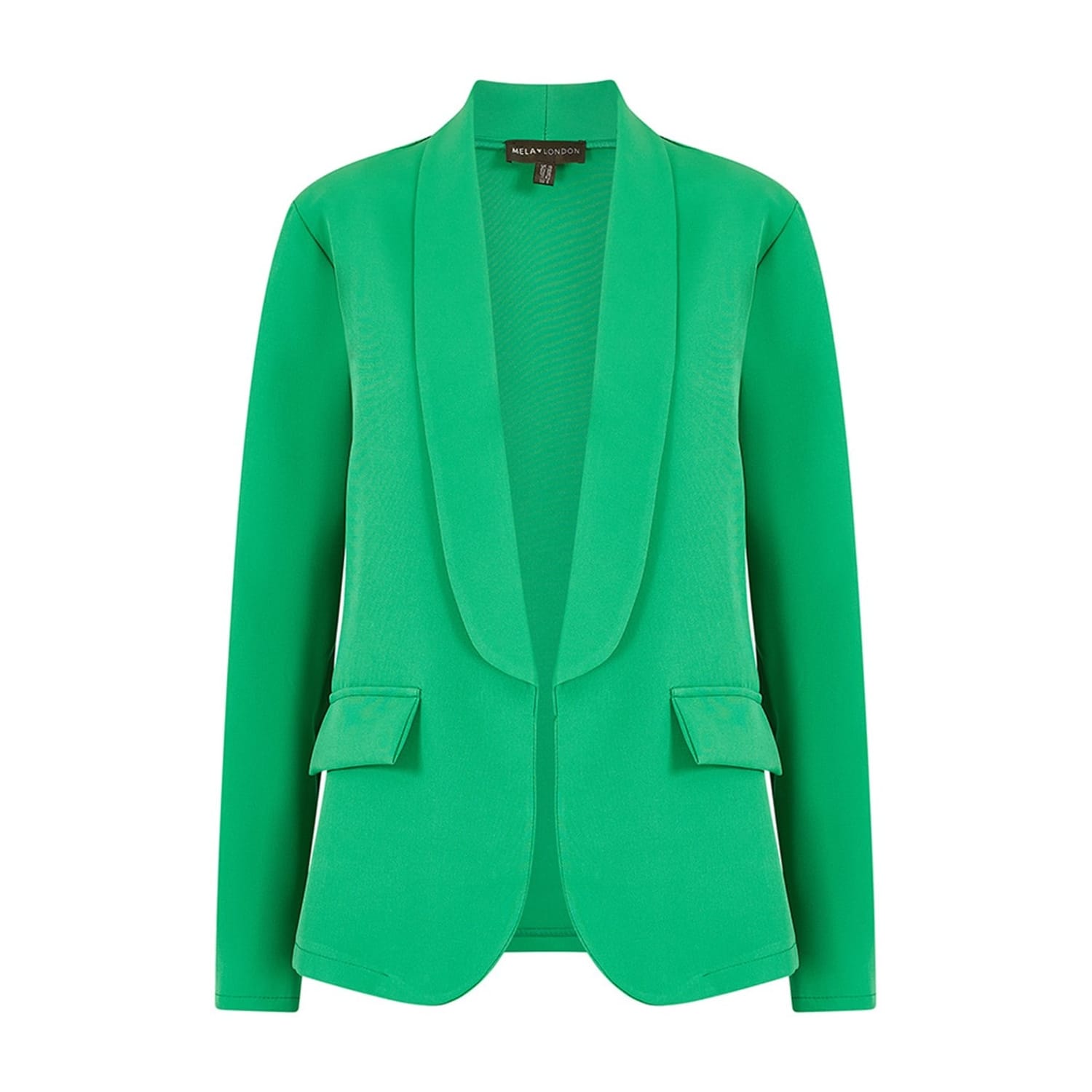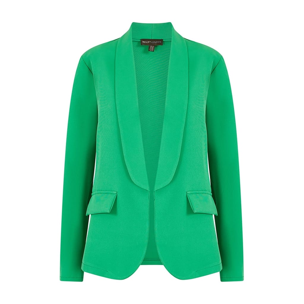 Elevate your workwear wardrobe with the Mela London blazer, part of the London City collection. This short jacket features a shawl neck and an open front, providing a regular fit. Crafted from a solid pattern, it is completed with functional pockets for added practicality. Ideal for a professional setting, this piece combines style and functionality effortlessly. -