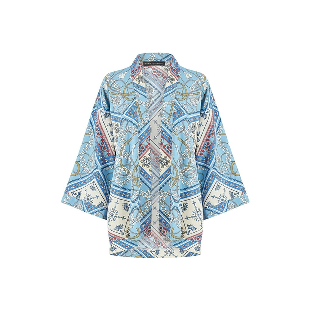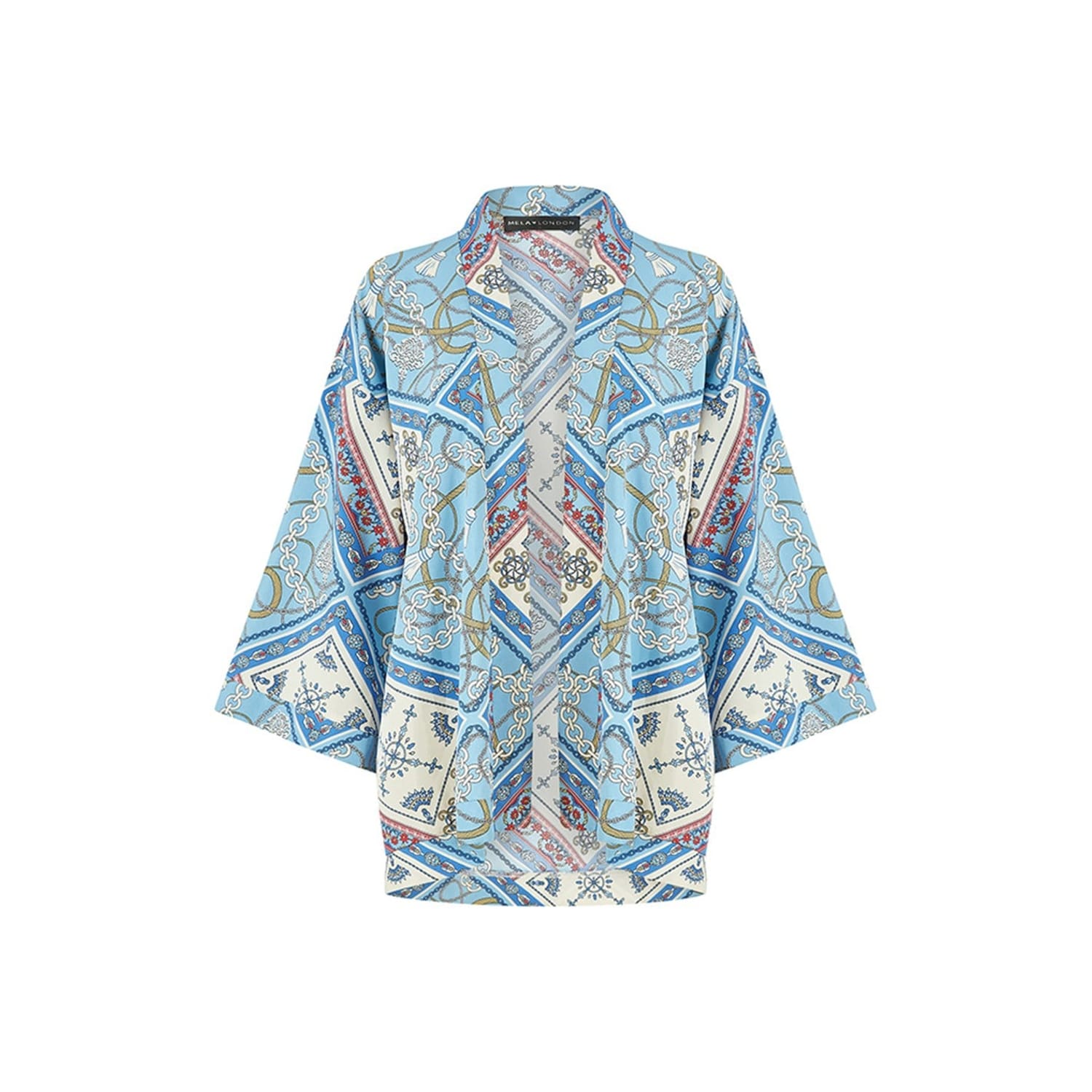 This Mela London top features a captivating chain print, embodying a unique London city charm. Adorned with chain embellishments, it offers a relaxed fit for effortless style. The three-quarter kimono sleeves add a touch of elegance, making it an ideal choice for those seeking both comfort and distinct fashion appeal. -