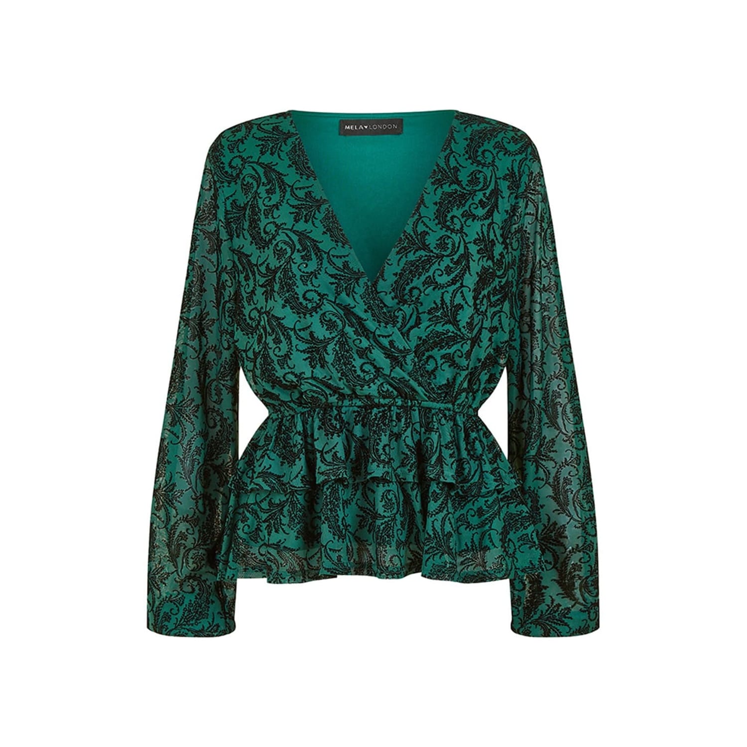 This Mela London blouse features a floral print, adding a touch of elegance to your wardrobe. With its long sleeves and a flattering V-neck, it offers a stylish look that is perfect for various occasions. The regular fit ensures comfort, while the London city theme adds a unique charm to this piece. -