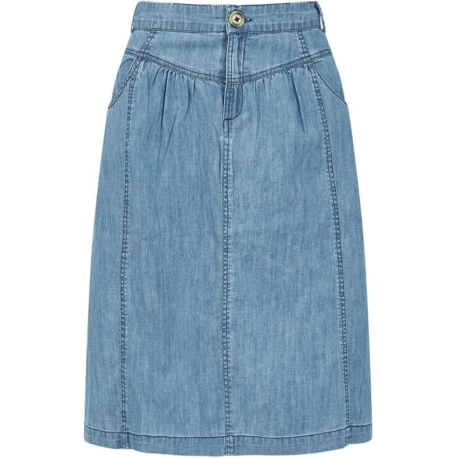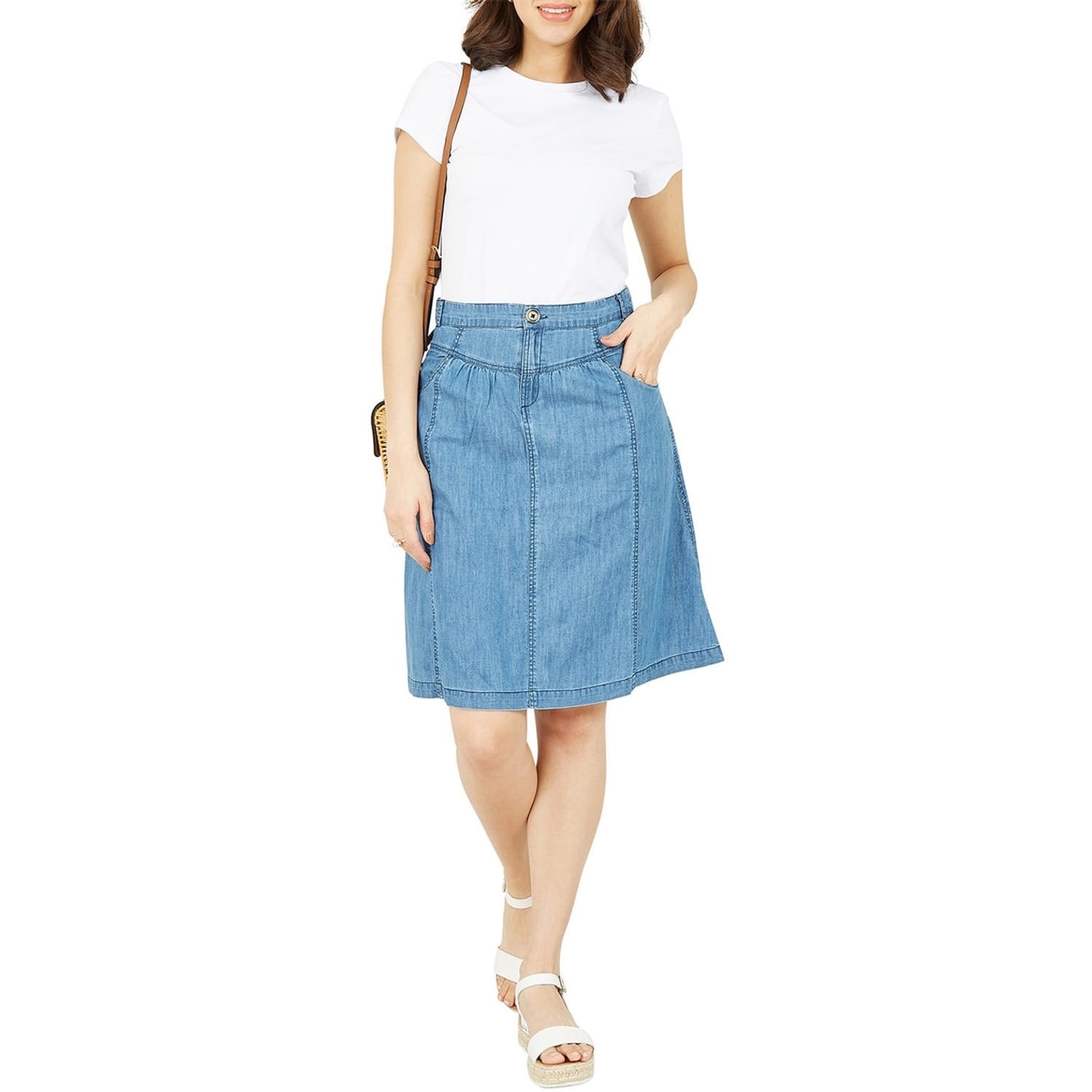 Discover the Yumi knee-length A-line skirt, perfect for casual collections. This regular fit skirt features a button and zip fly closure, offering both style and practicality. The addition of pockets enhances its functionality, making it a versatile choice for everyday wear. -