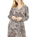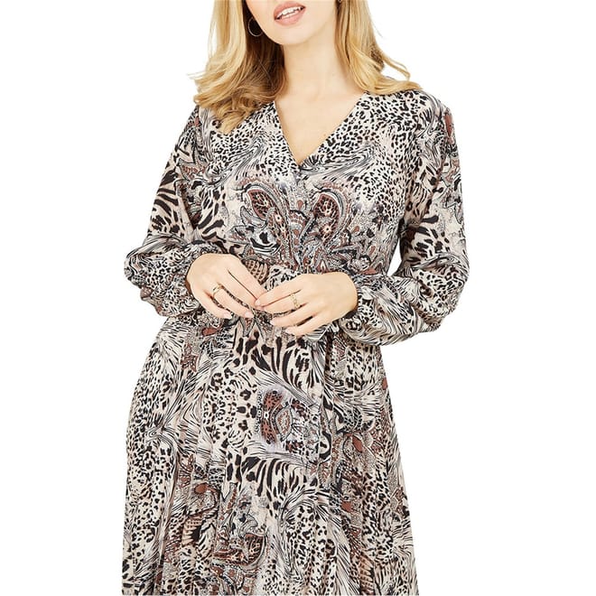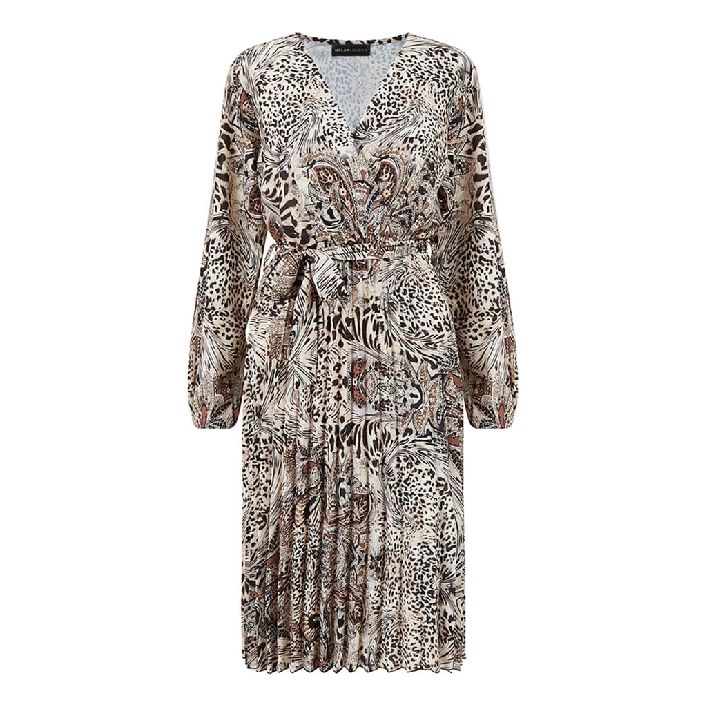 This Mela London wrap dress features a striking animal pattern, perfect for making a statement. The midi length and V-neck design add a touch of elegance, while the pleat embellishments enhance its sophisticated appeal. Ideal for city outings, this dress combines style and comfort effortlessly. -