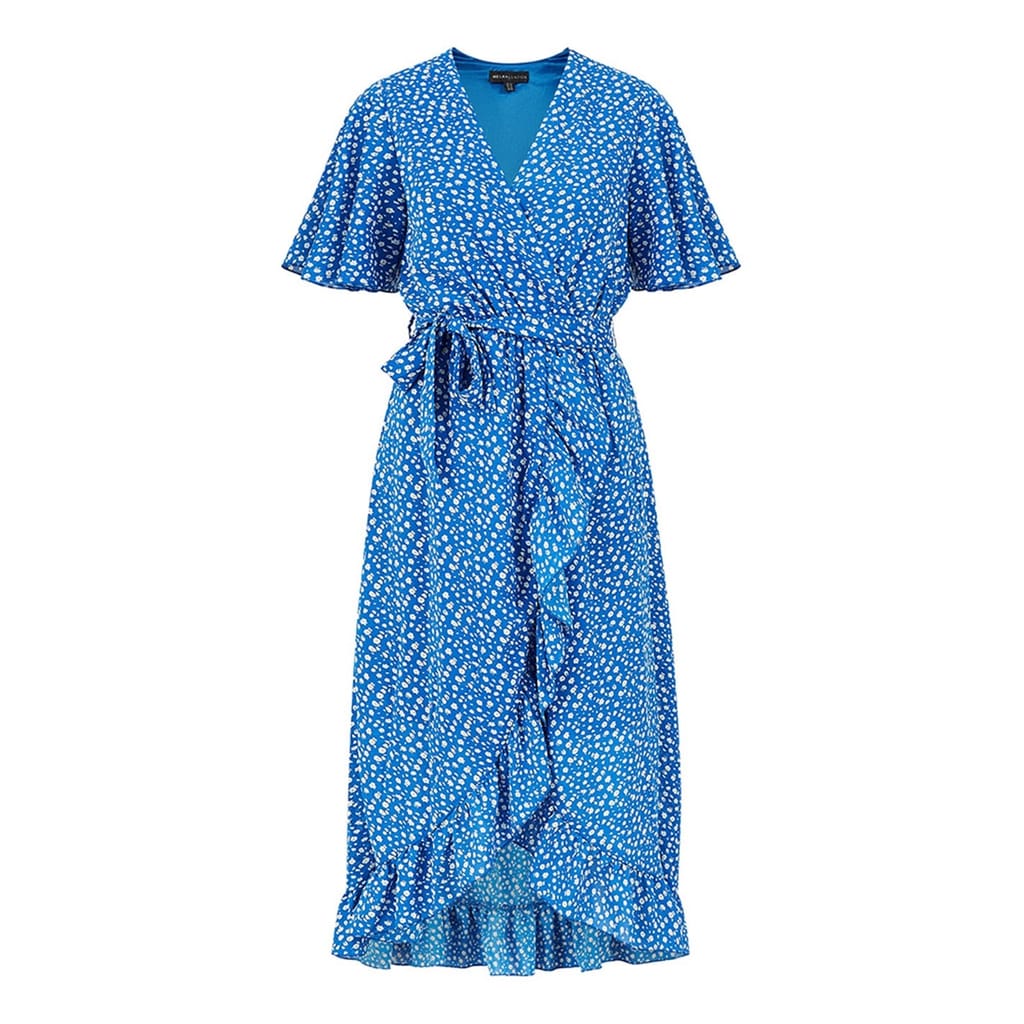 Embrace elegance with this Mela London midi dress, featuring a wrap style and a charming floral pattern. The dress boasts a flattering V-neck and flutter short sleeves, adding a touch of femininity. A tie waist closure enhances the regular fit, while the ruffle hem and wrap front detail complete the look, making it a perfect choice for any occasion. -