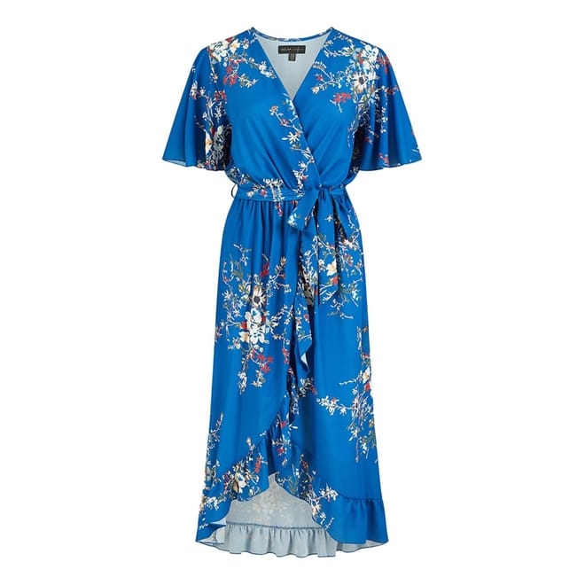 Embrace elegance with the Mela London wrap midi dress, perfect for any occasion. This London City dress features a charming floral pattern and a flattering V-neck. The short flutter sleeves add a touch of femininity, while the hi-lo hemline creates a graceful silhouette. The tie waist closure ensures a comfortable regular fit, complemented by delicate ruffle embellishments. -