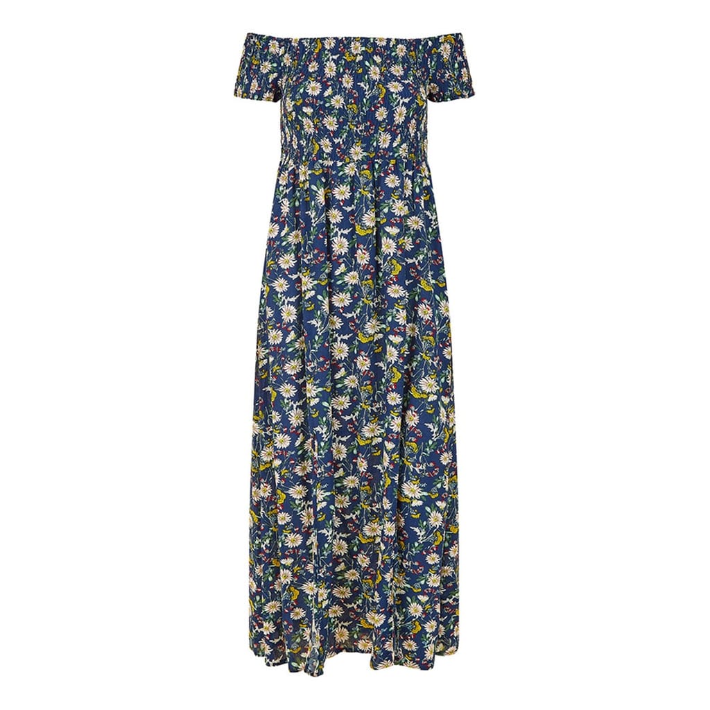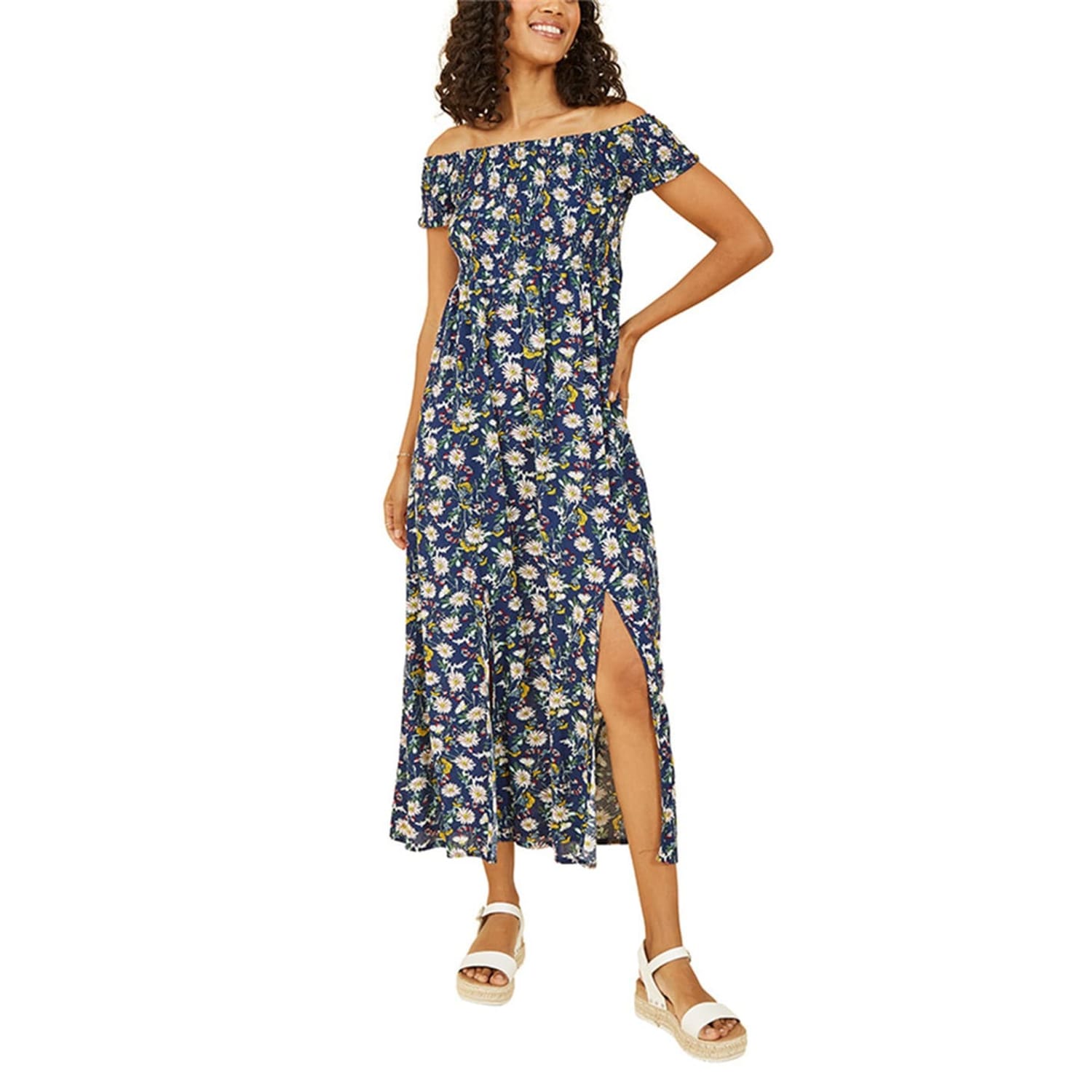 This Mela London midi dress features a wrap style with a ruched embellishment, offering a flattering silhouette. The off-the-shoulder neckline adds a touch of elegance, while the floral pattern brings a vibrant charm. The dress is designed with a straight hem, making it a versatile choice for various occasions. -