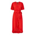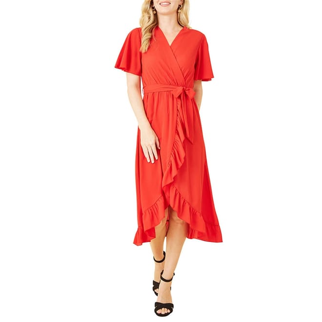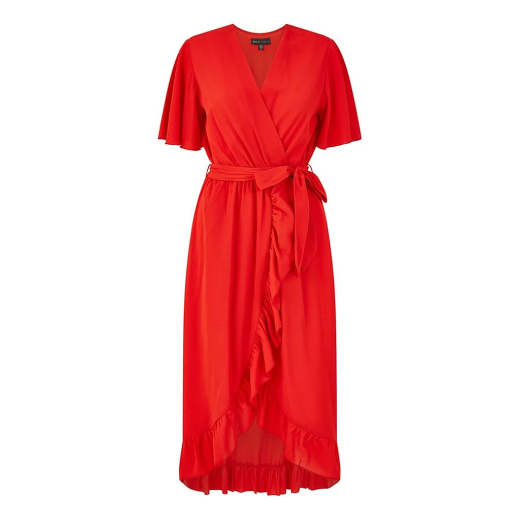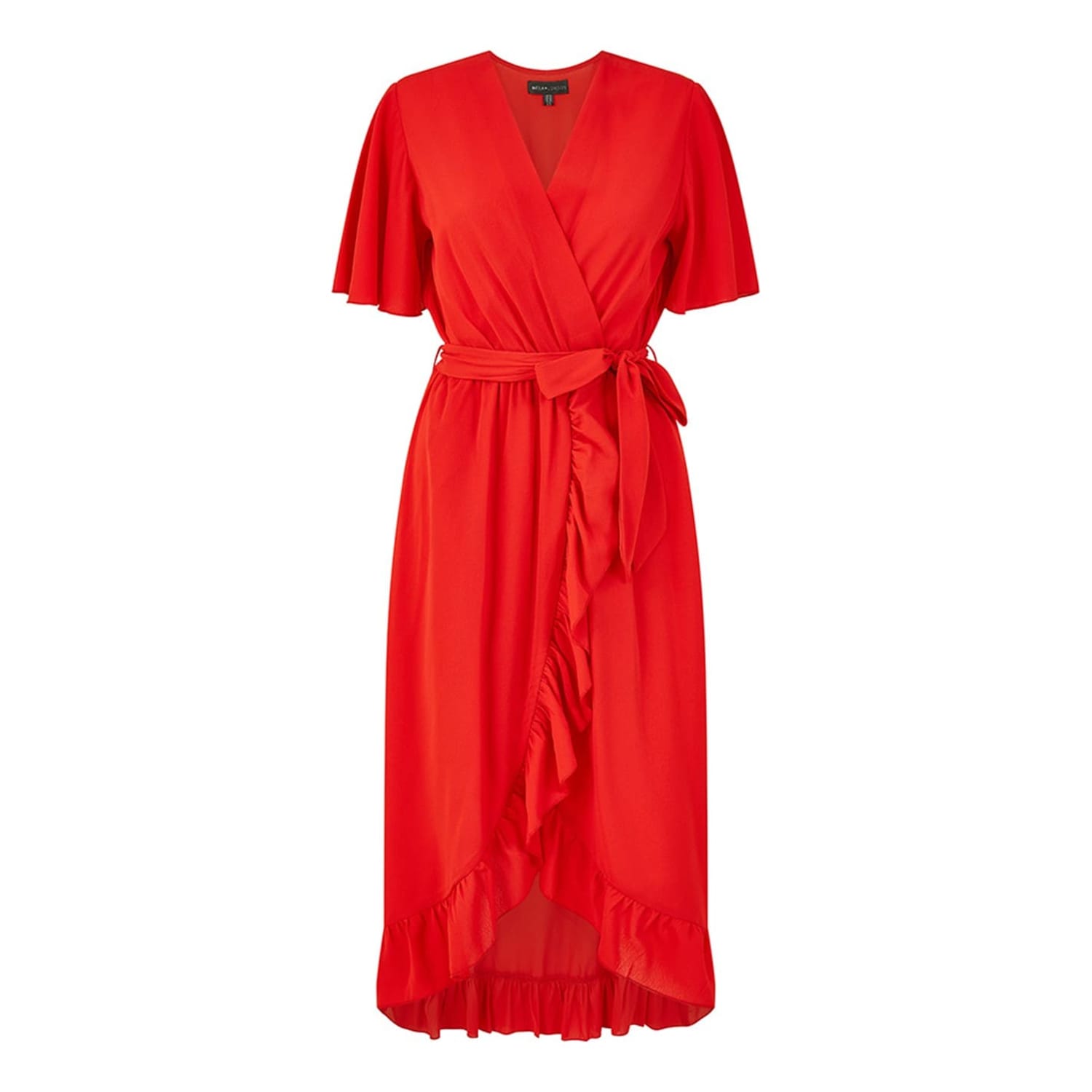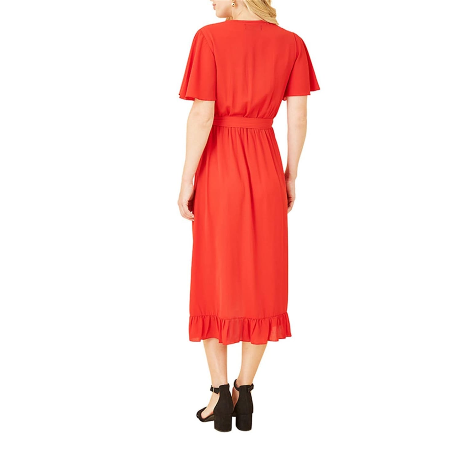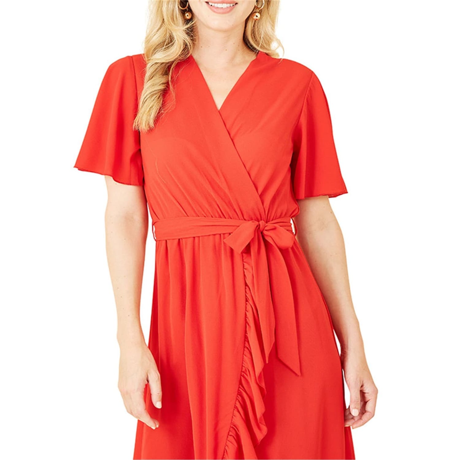 Embrace elegance with the Mela London wrap dress, a perfect addition to your wardrobe. This midi-length dress features a flattering V-neck and short flutter sleeves, offering a sophisticated look. The solid pattern and ruffle hem add a touch of charm, while the tie waist ensures a regular fit. Ideal for any occasion, this London City dress combines style and comfort effortlessly. -