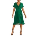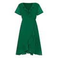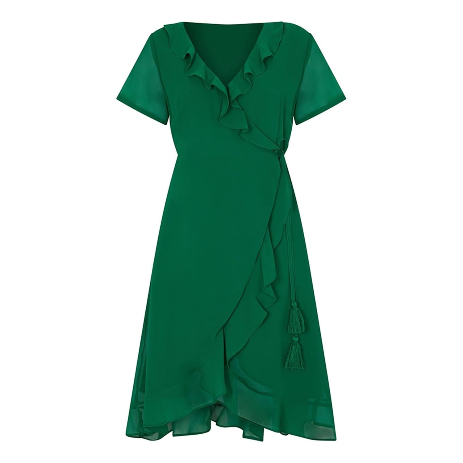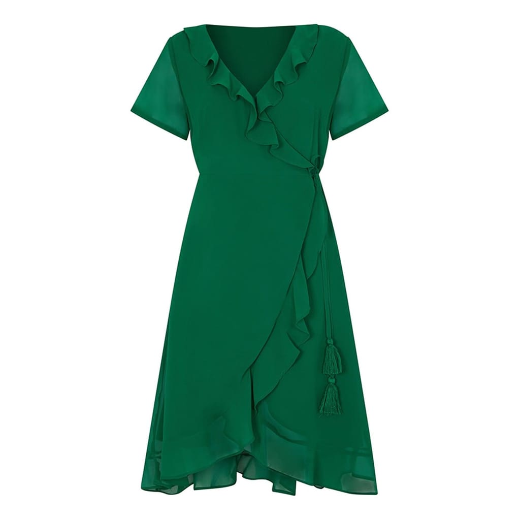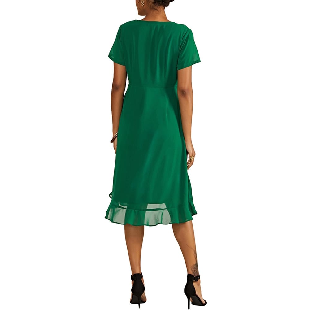 This Yumi wrap dress is a stylish choice for any occasion. Featuring a midi length and a flattering V-neck, it offers a sophisticated look. The short sleeves are adorned with ruffles, adding a touch of elegance, while the ruffle hem enhances its feminine appeal. The solid pattern and tie waist closure complete this chic ensemble. -