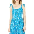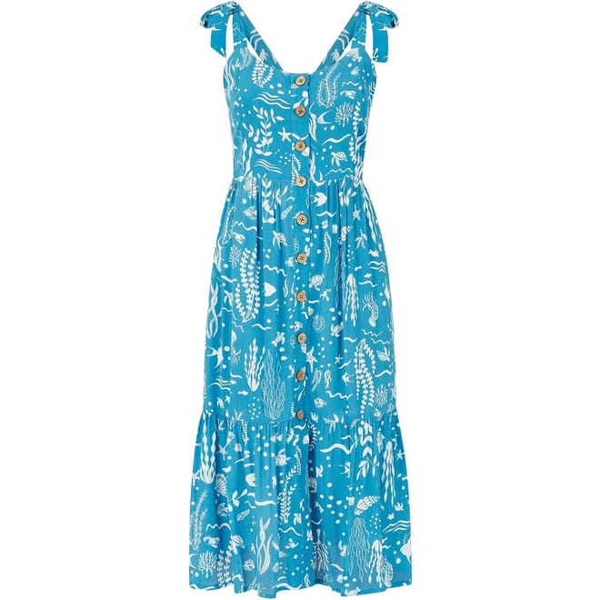 Discover the Yumi slip dress, featuring a captivating sealife print. This midi dress showcases a scoop neckline and tie shoulder details, adding a touch of elegance. The aquatic print enhances its unique appeal, while the button closure ensures a secure fit. Perfect for those seeking a stylish and distinctive addition to their wardrobe. -