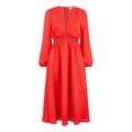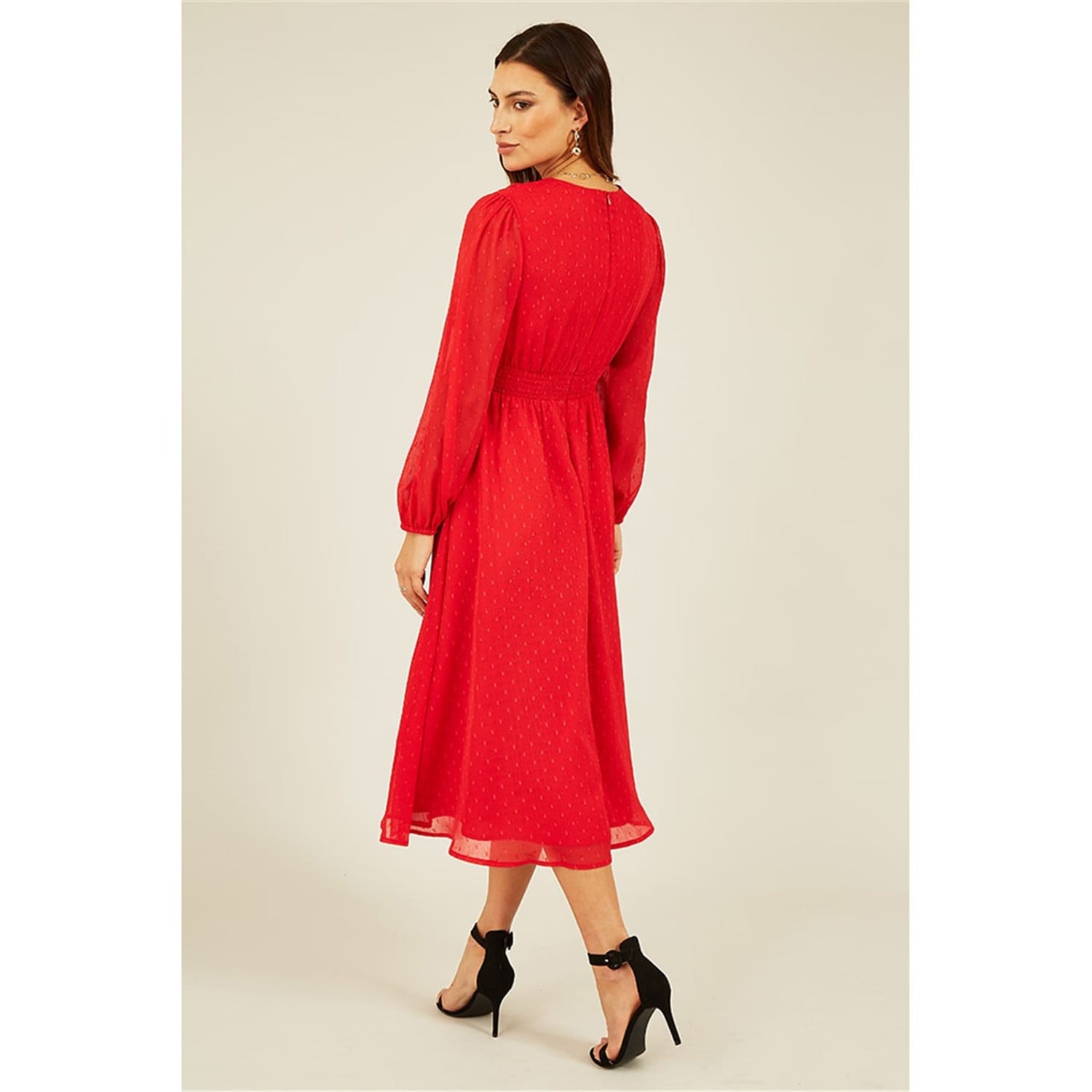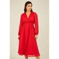 This Yumi midi dress features a sophisticated V-neck and long bishop sleeves, offering a classic yet contemporary look. The solid pattern and regular fit make it a versatile addition to any wardrobe, perfect for various occasions. -