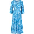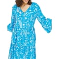 Discover the Yumi midi dress, featuring a captivating sealife print that brings an aquatic theme to life. This tiered dress is designed with a V-neck and three-quarter bell sleeves, offering a unique and stylish look. Perfect for those who appreciate intricate prints and elegant design, this dress is a standout piece for any occasion. -