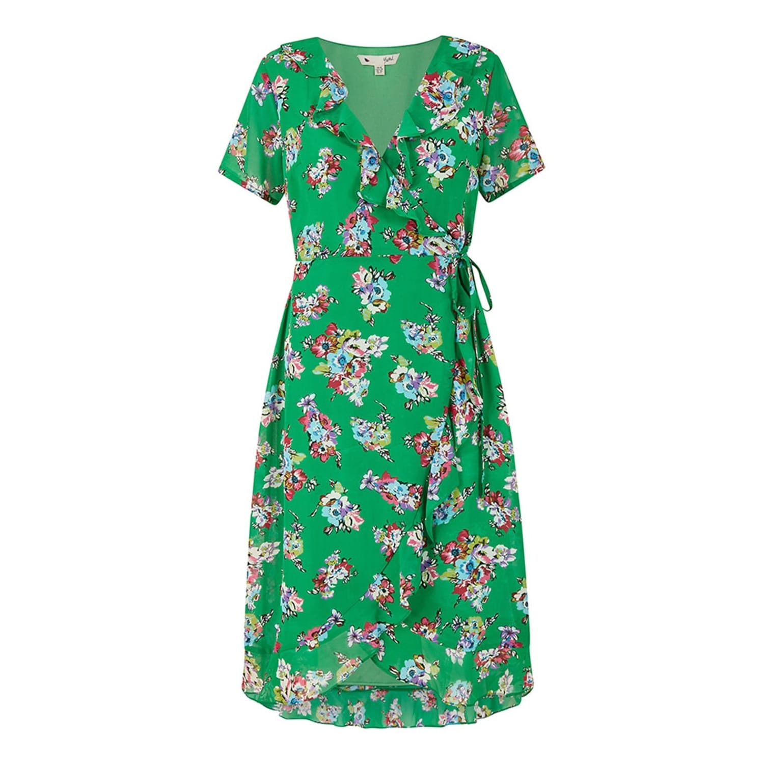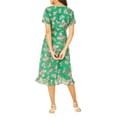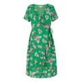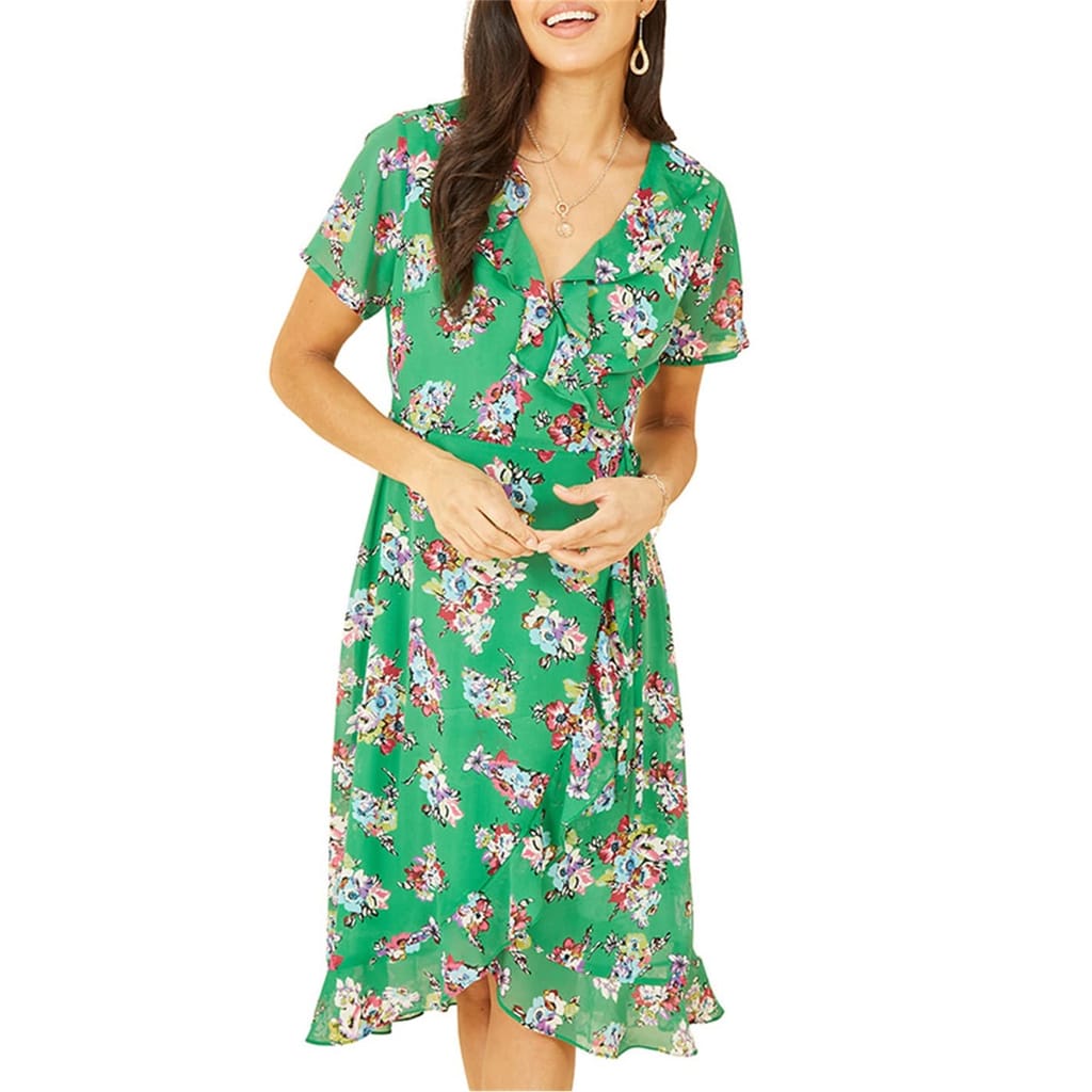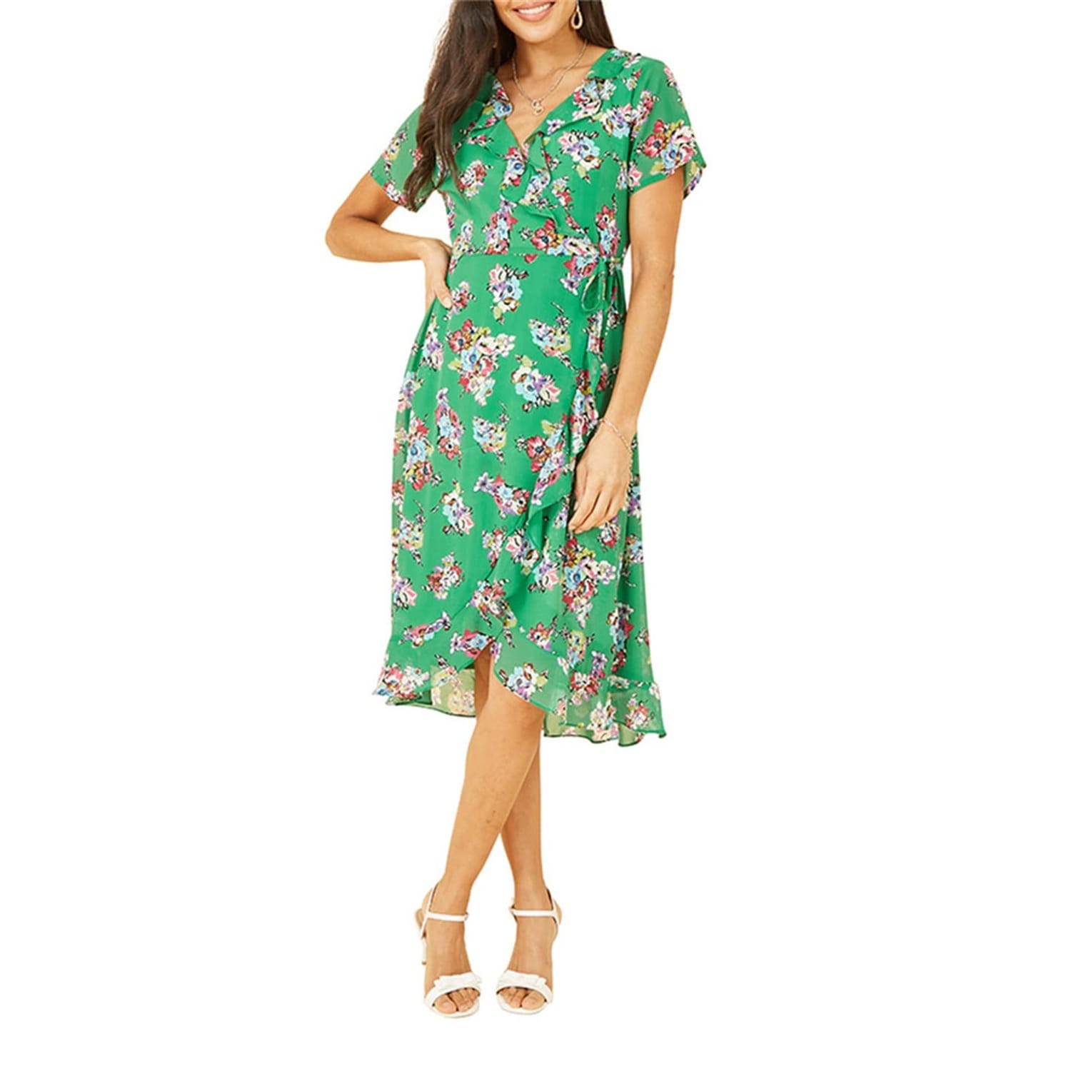 This Yumi wrap dress features a charming floral pattern, perfect for any occasion. The midi length and V-neck design offer a flattering silhouette, while the short sleeves provide comfort. A tie waist closure enhances the fit, and the ruffle hem adds a touch of elegance. Ideal for those seeking a stylish and versatile addition to their wardrobe. -