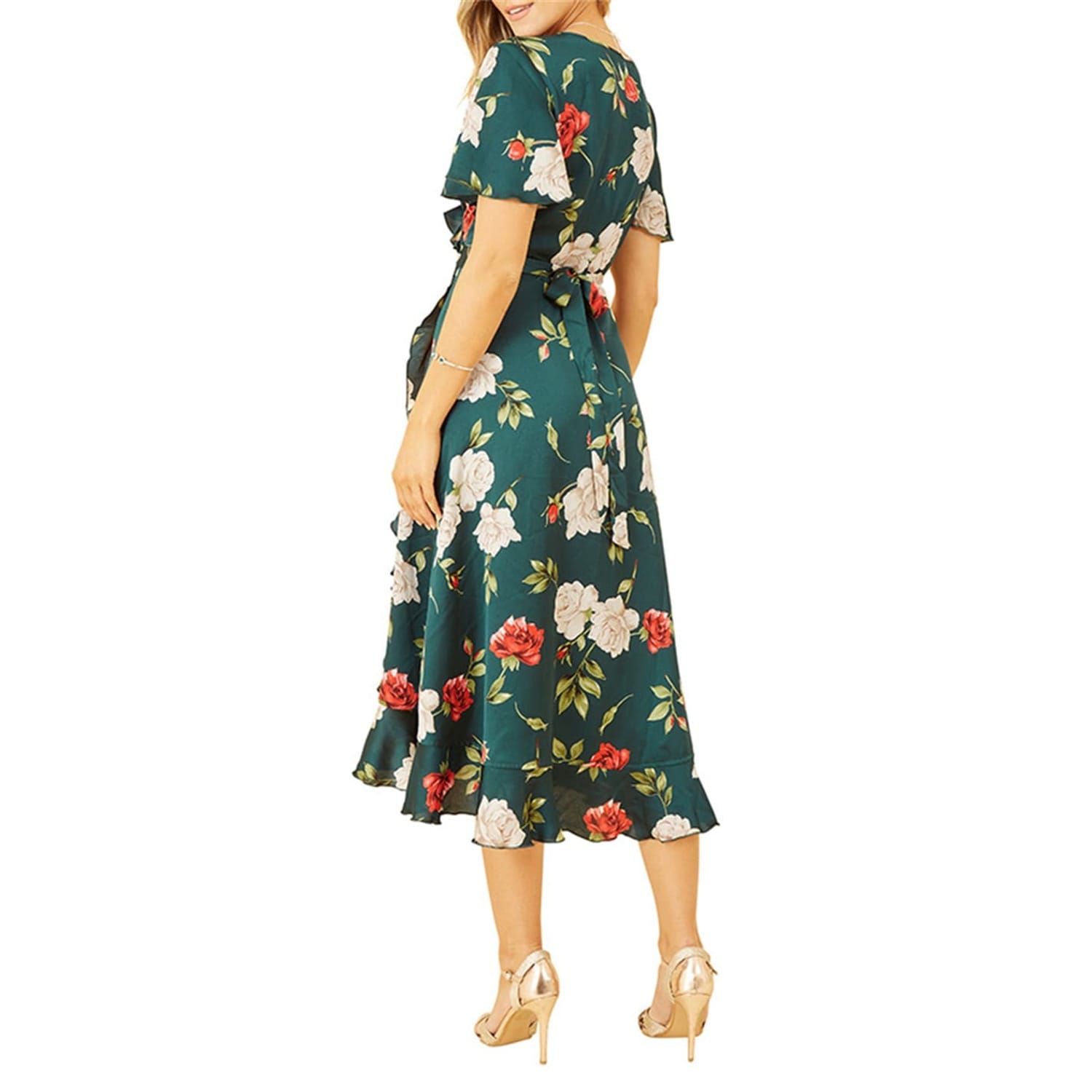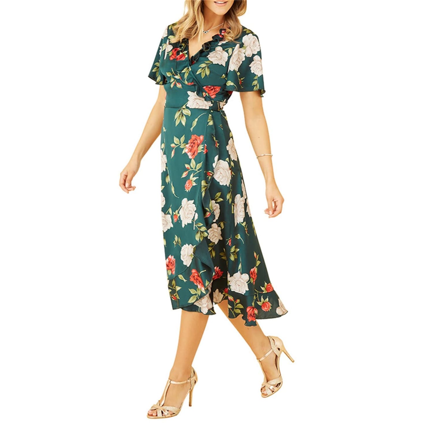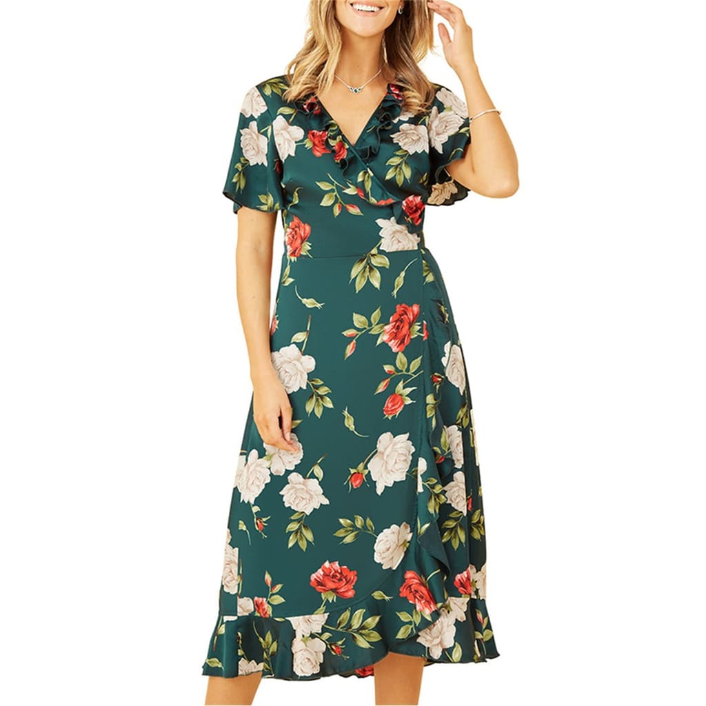 Discover the Yumi wrap dress, a perfect blend of style and comfort. This midi dress features a charming floral print, complemented by a v-neck and short ruffle sleeves. The tie closure adds a touch of elegance, while the ruffle hem enhances its feminine appeal. Designed in a regular fit, this dress is ideal for those who appreciate both fashion and functionality. -