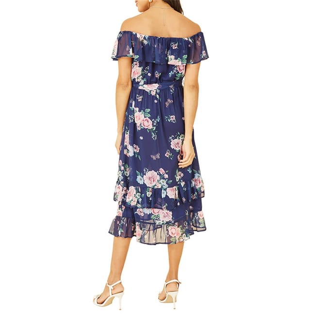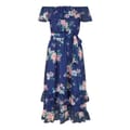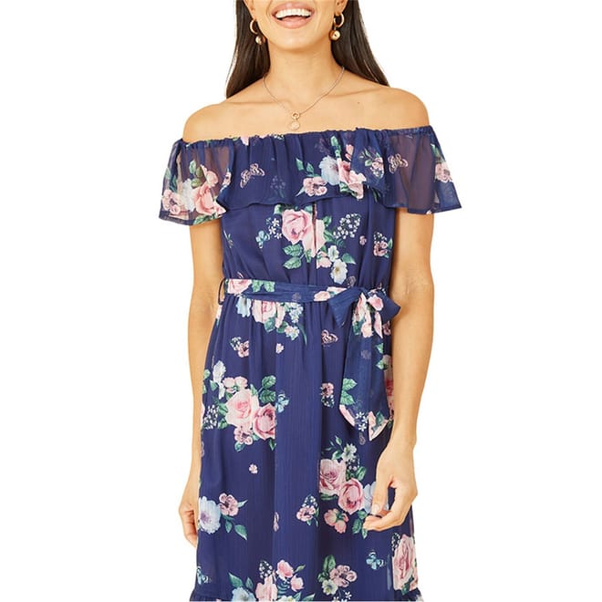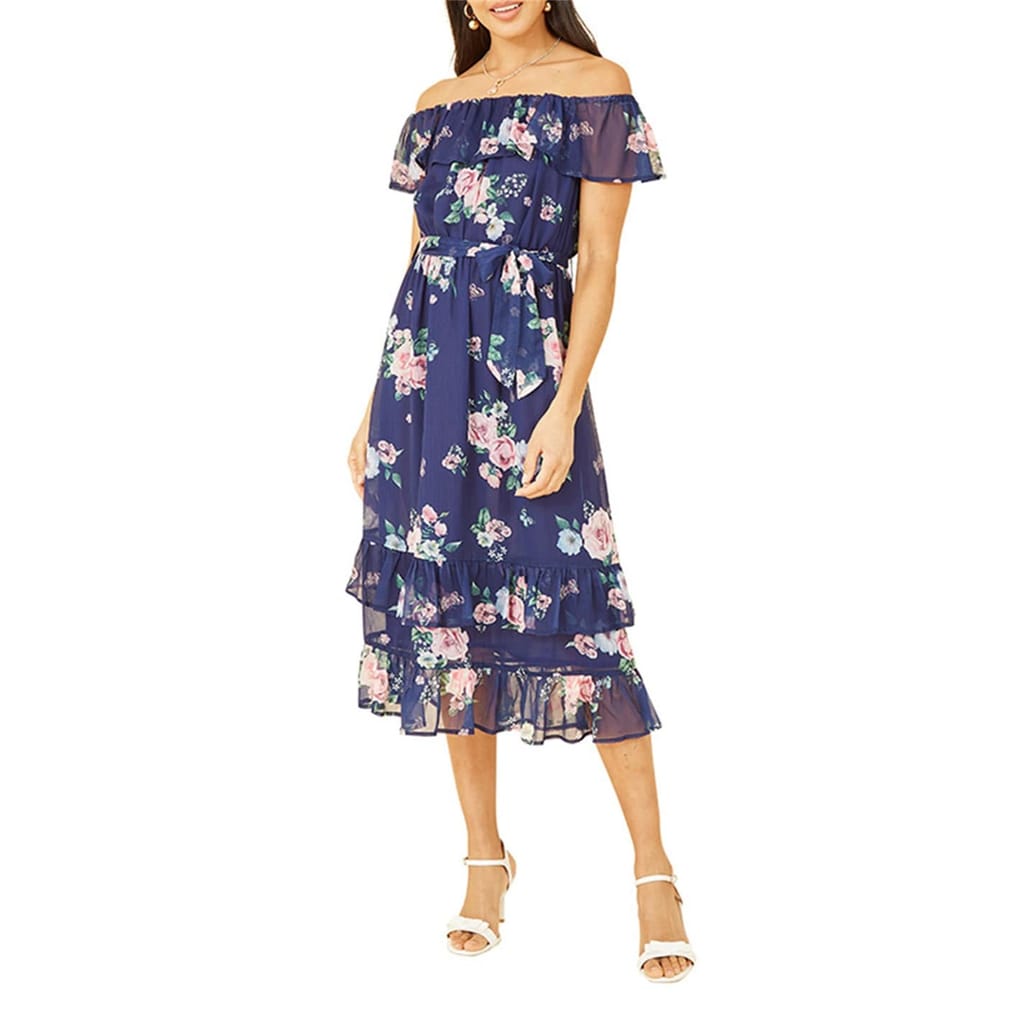 This Yumi midi dress features a charming floral pattern and an off-the-shoulder neckline, perfect for a stylish look. The A-line style is complemented by a ruffle hem and tie waist, adding a touch of elegance. The dress is adorned with ruffles, enhancing its feminine appeal. -