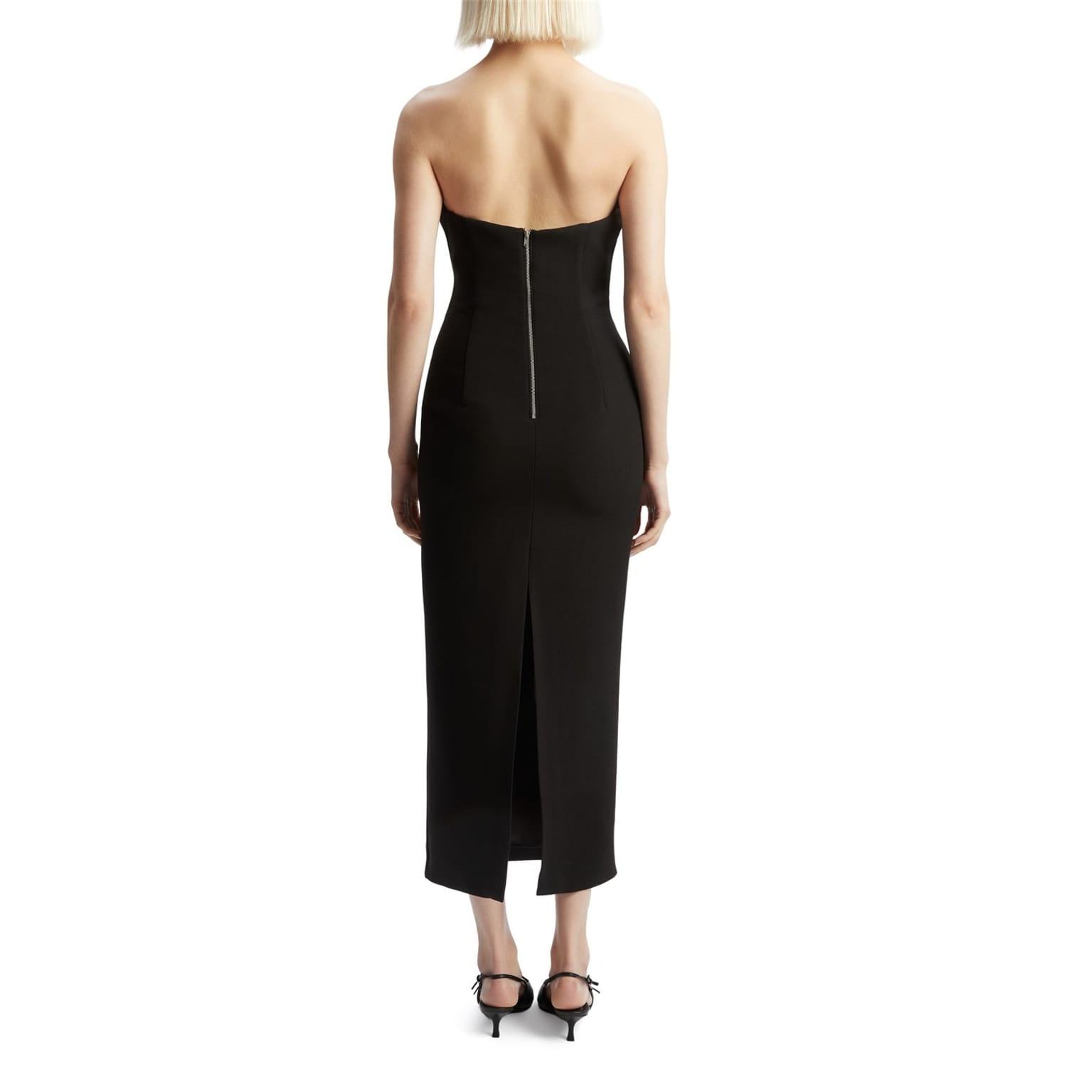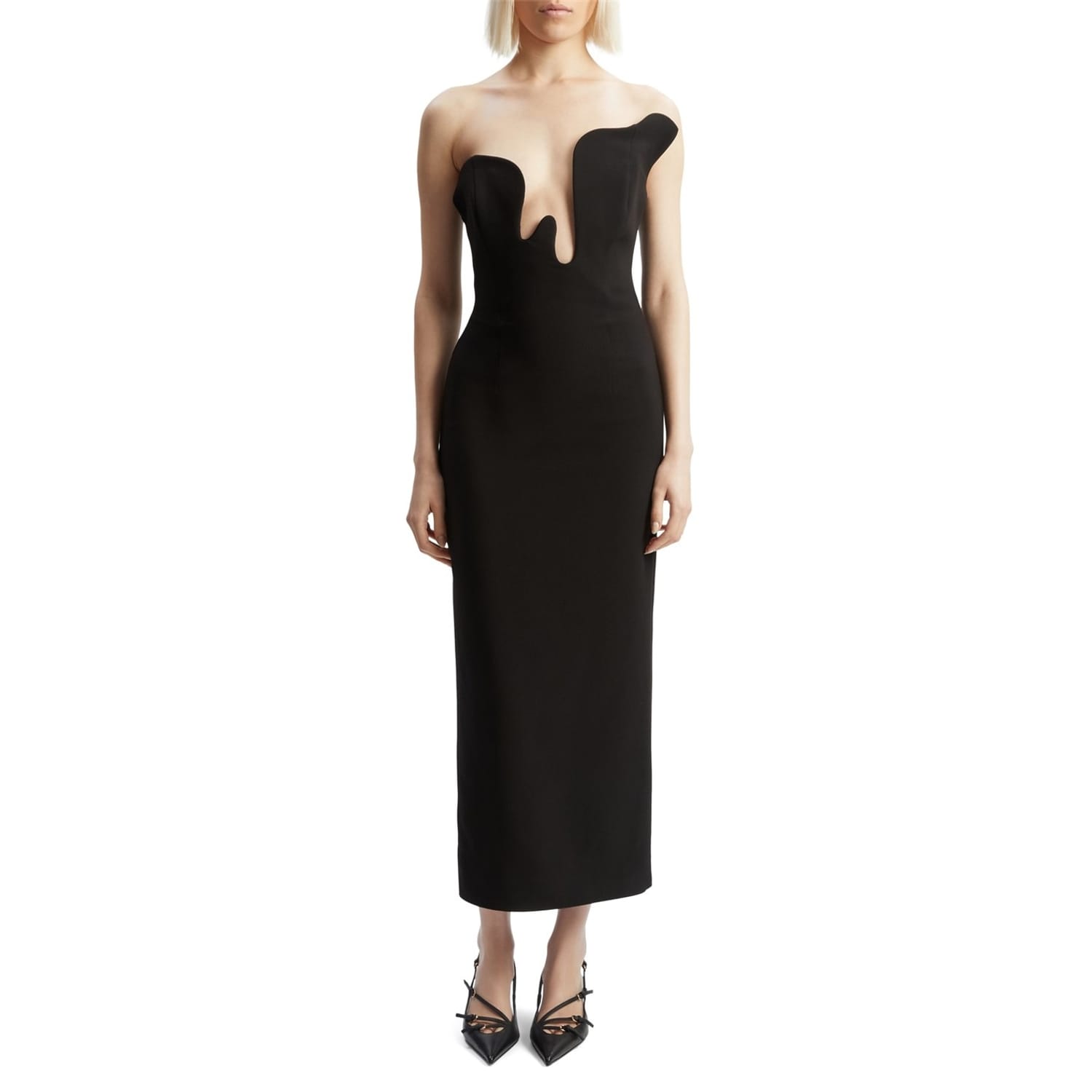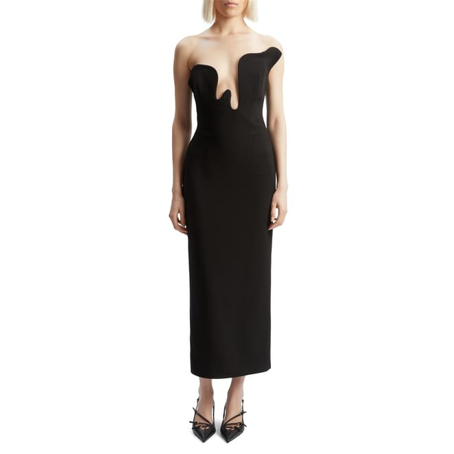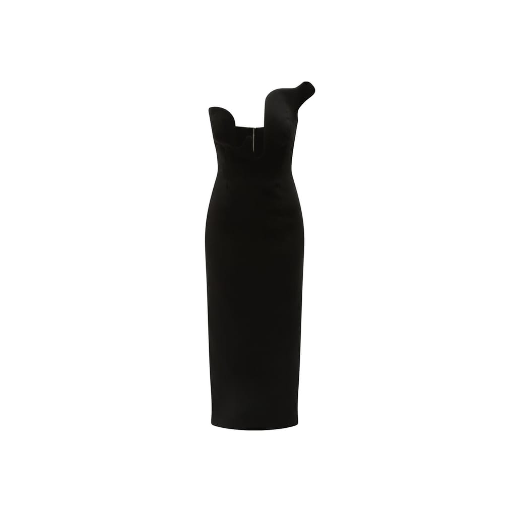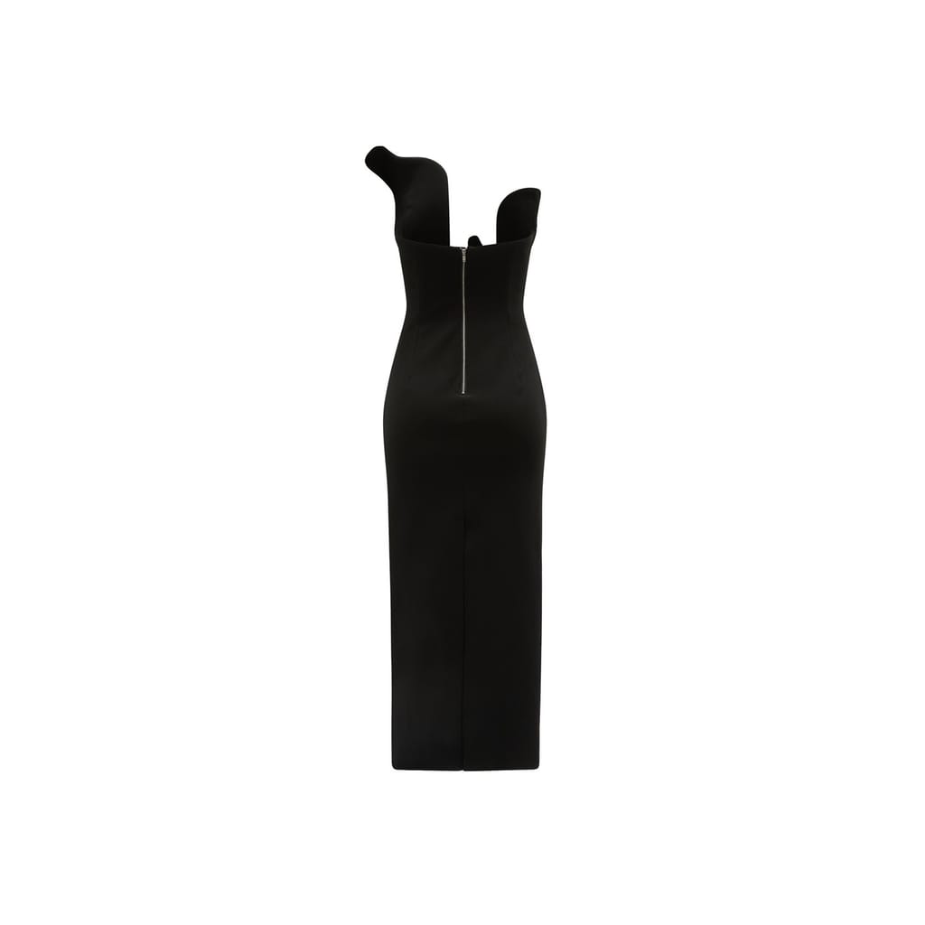 The Rosalyn Midi Dress is an occasion wear moment. It features a strapless, midi-length silhouette with an abstract wire design, boning through the bodice and back split for movement. -