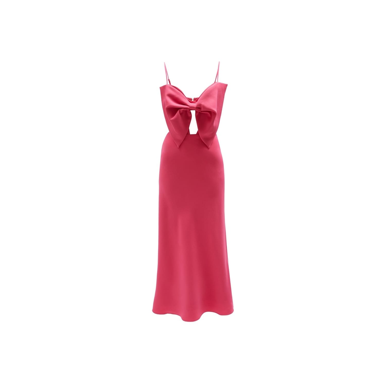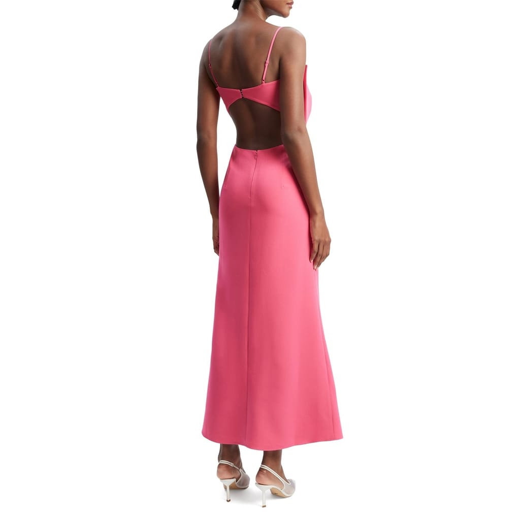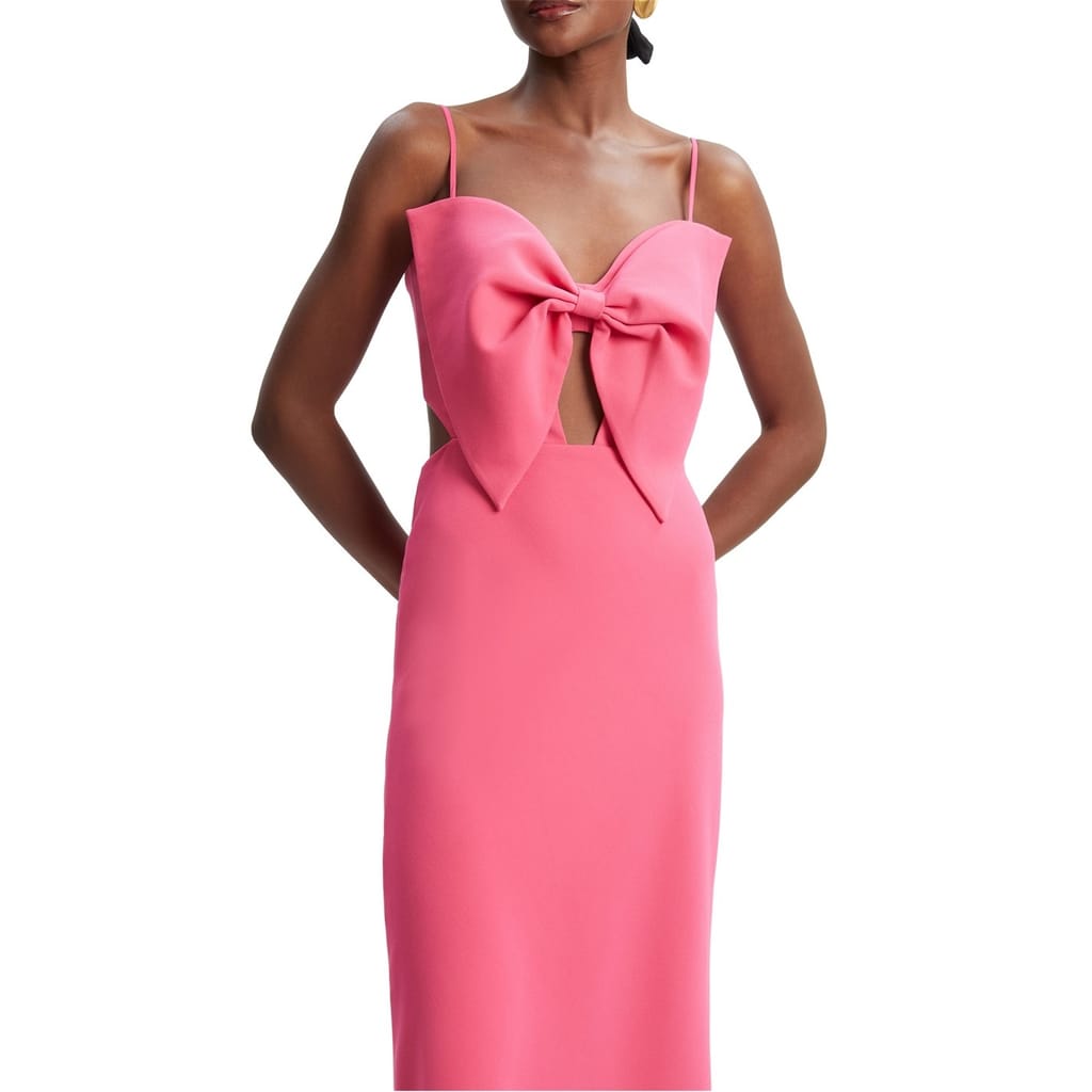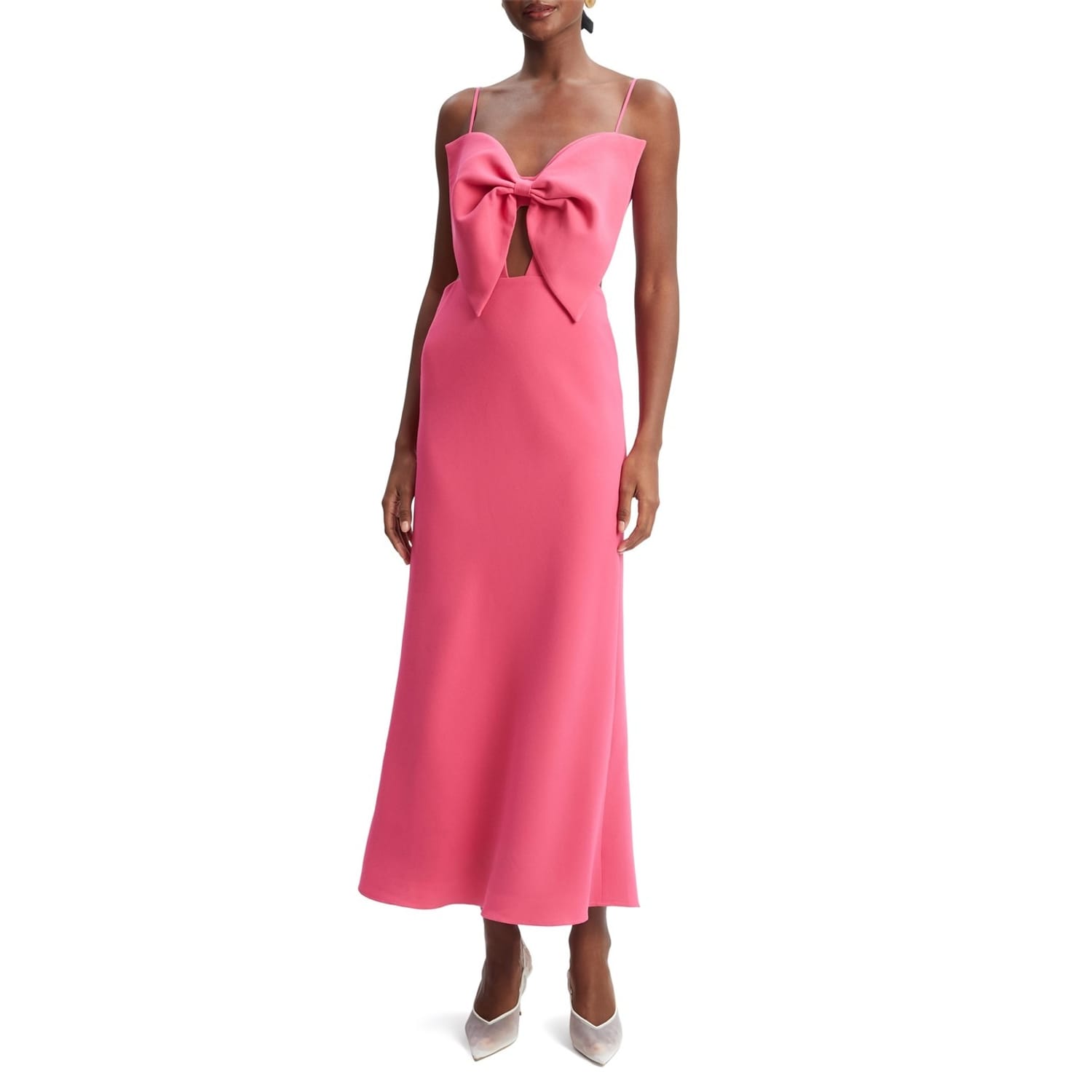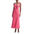 This Bardot maxi dress features a sweetheart neckline and a-line style, offering a slim fit. The solid pattern is elegantly complemented by spaghetti straps and a charming bow embellishment, making it a sophisticated choice for any occasion. -