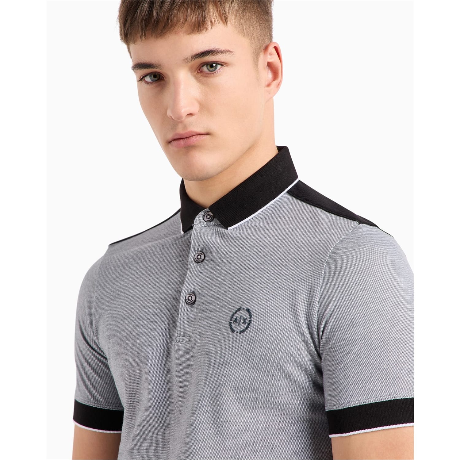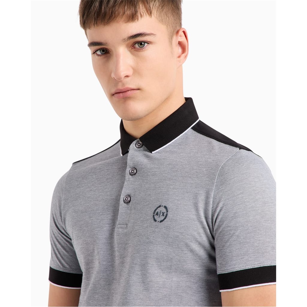 This Armani Exchange top is a semi-formal piece featuring a polo collar and short sleeves. Crafted in a solid pattern, it offers a regular fit with a button closure. The design is completed with a subtle logo embellishment, making it a versatile addition to your wardrobe. -
