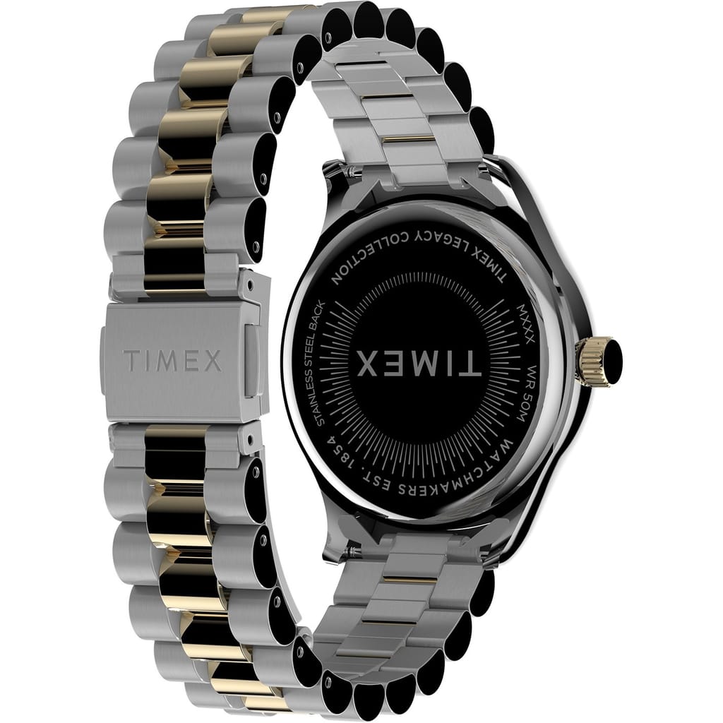 The Timex Legacy wrist watch from the Classics collection is a timeless piece. Featuring an analogue display, it boasts a mother of pearl white dial that adds a touch of elegance. The steel bracelet strap ensures durability and style, while its 50m water resistance offers practicality for everyday use. This watch is a perfect blend of classic design and modern functionality. -