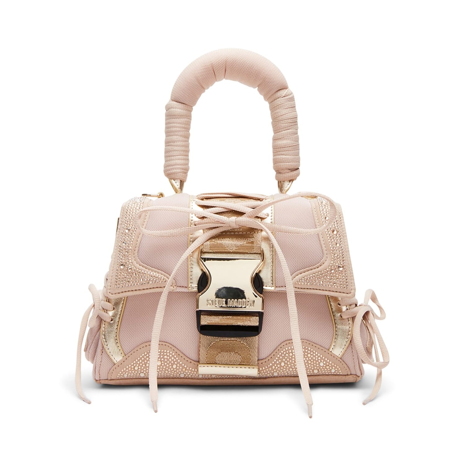 Introducing the Steve Madden handbag, a stylish addition to your collection. This bag features a secure buckle closure and a convenient top handle for easy carrying. Adorned with elegant rhinestone embellishments, it offers a touch of glamour to any ensemble. Perfect for those who appreciate both functionality and fashion. -