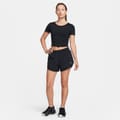 This Nike cropped top is designed for performance, featuring a crew neck and short sleeves. With a slim fit and solid pattern, it is part of the activewear collection. The top is embellished with a logo, adding a touch of brand identity. -