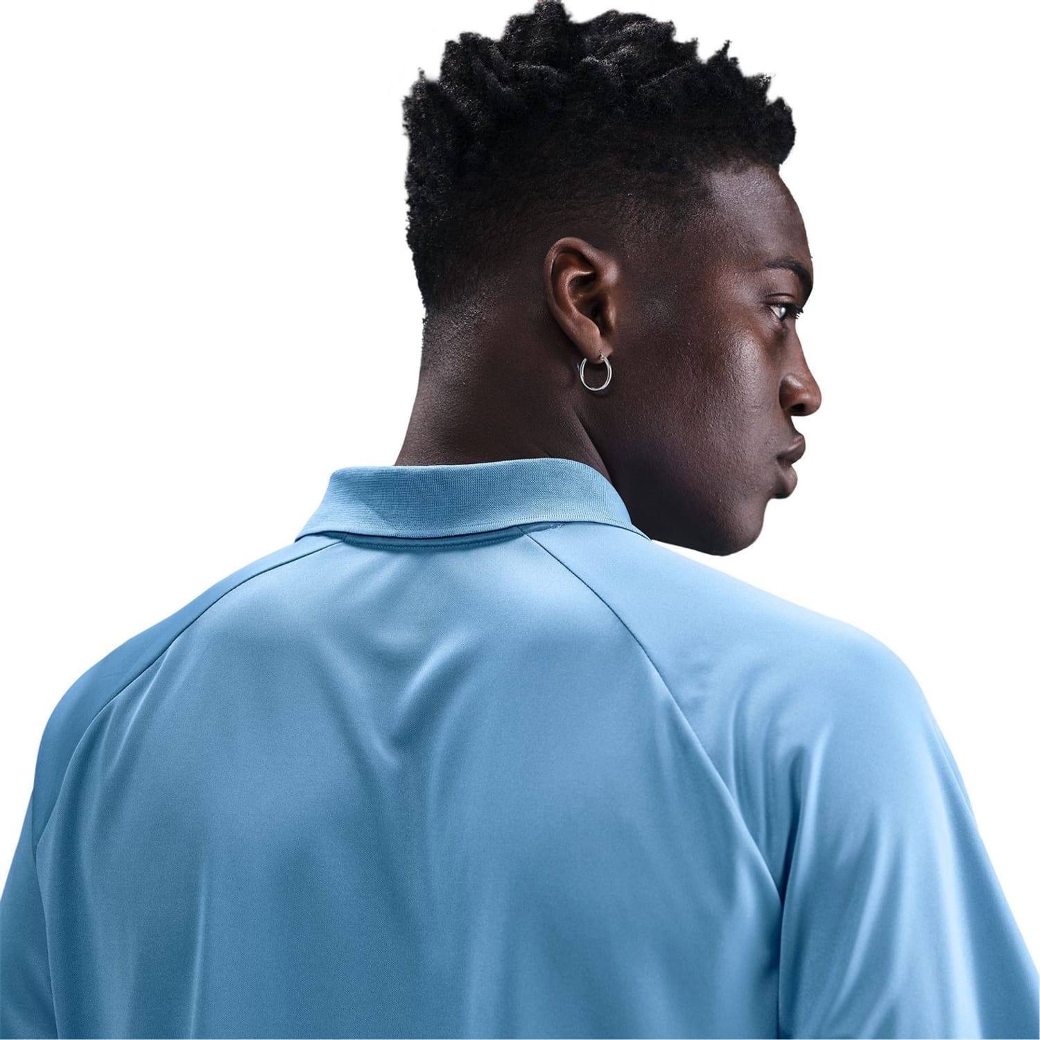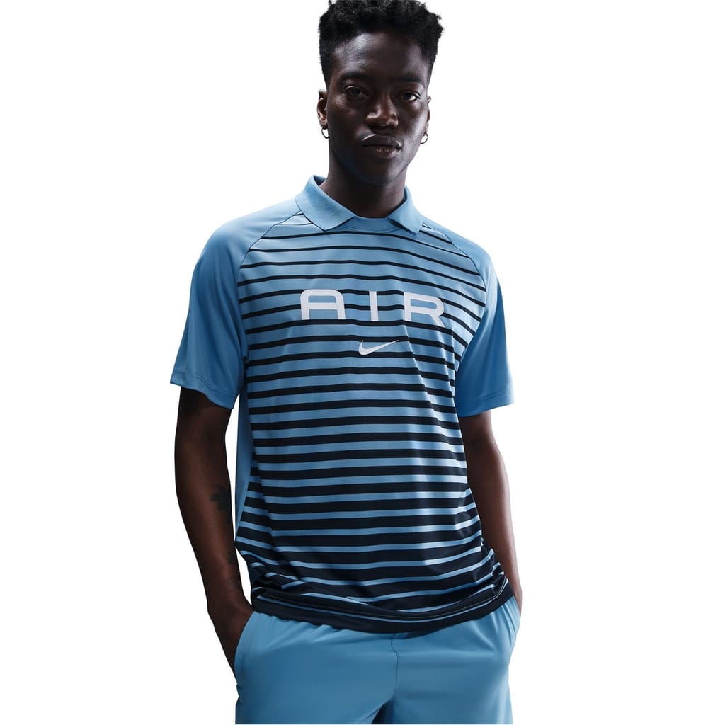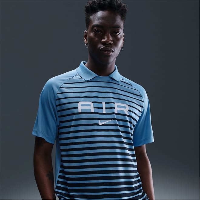 This Nike top features a regular fit with short raglan sleeves and a polo collar. The horizontal stripe pattern adds a classic touch, while the logo embellishment provides a signature finish. -