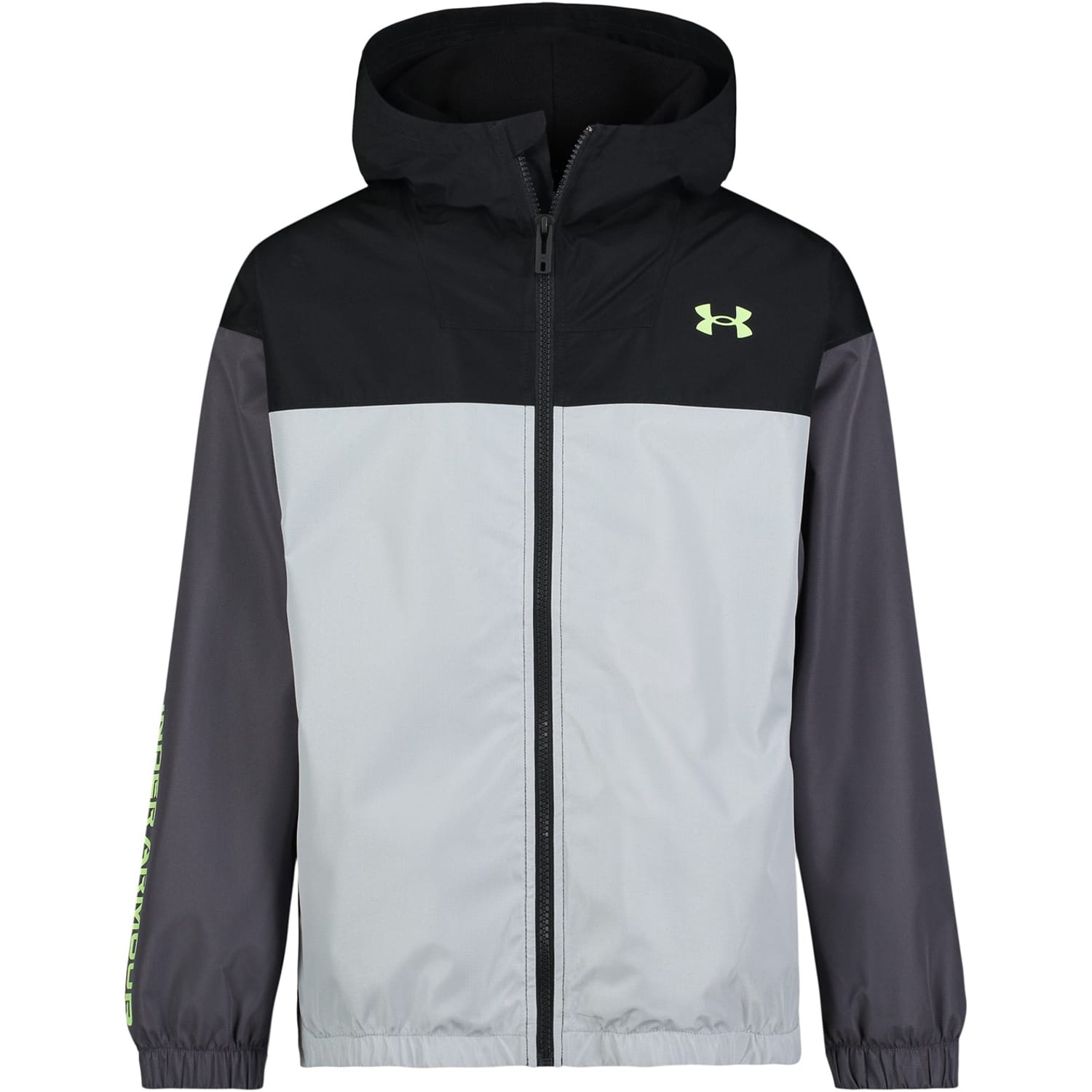 The Under Armour rain jacket for juniors is designed to keep you dry and comfortable. Featuring a hooded neckline and a zip closure, it provides water-resistant protection. The jacket's regular fit and elasticated cuffs enhance mobility, while the color block pattern adds a stylish touch. The Under Armour logo embellishment completes this practical and fashionable piece. -