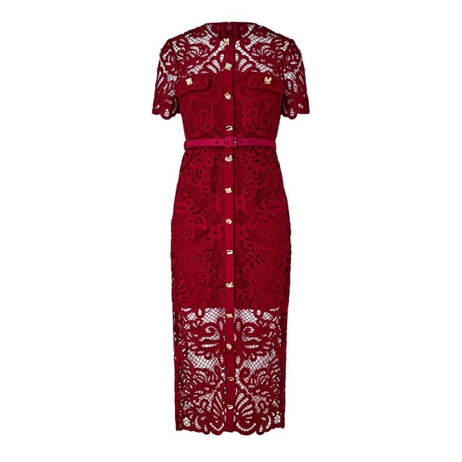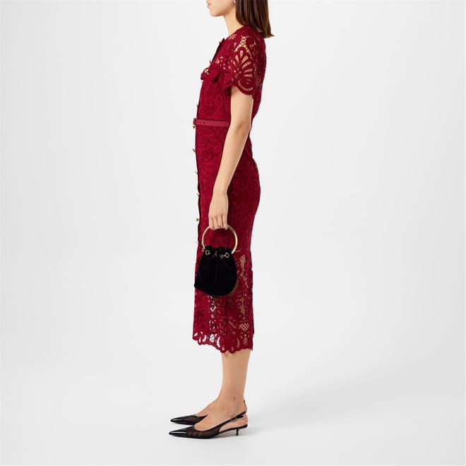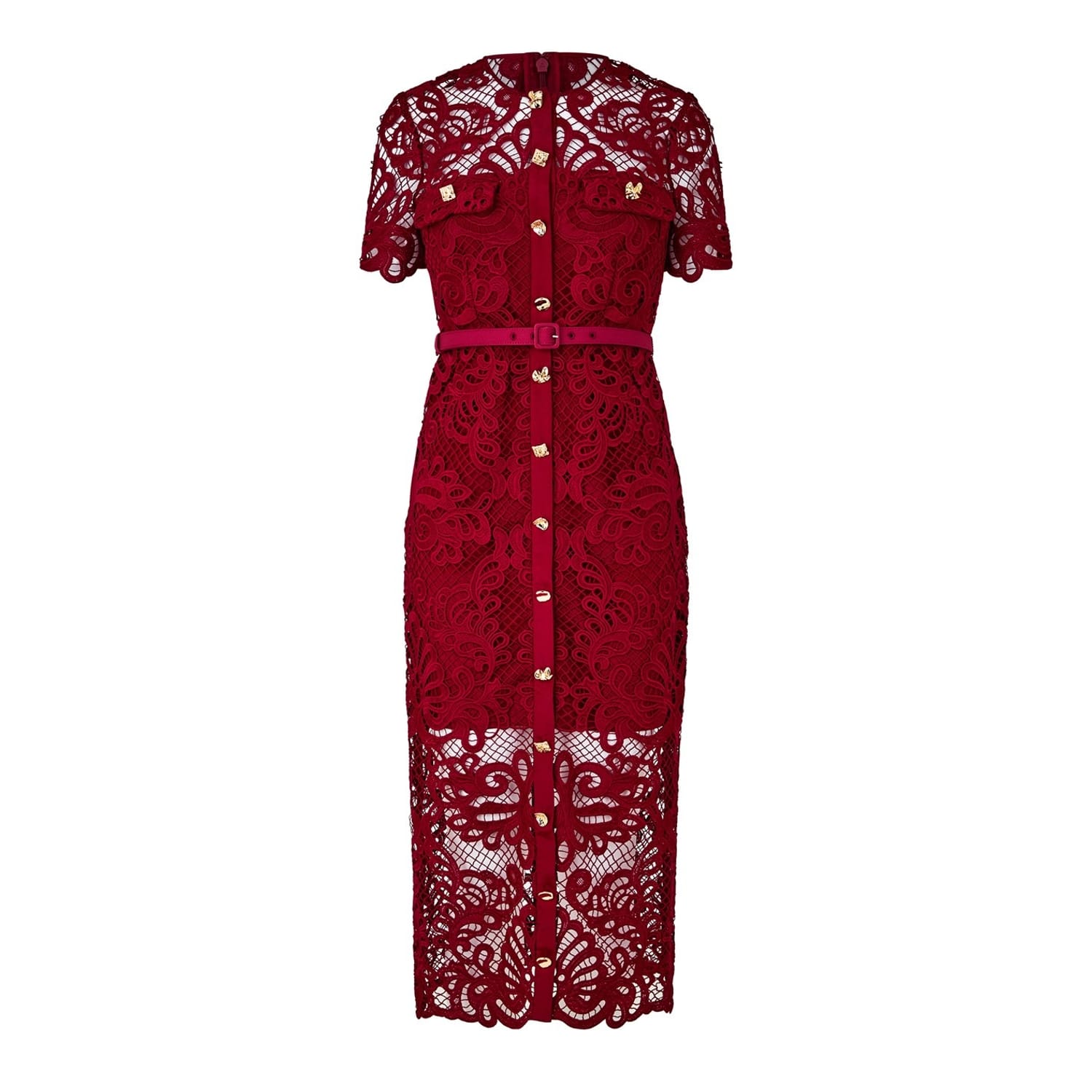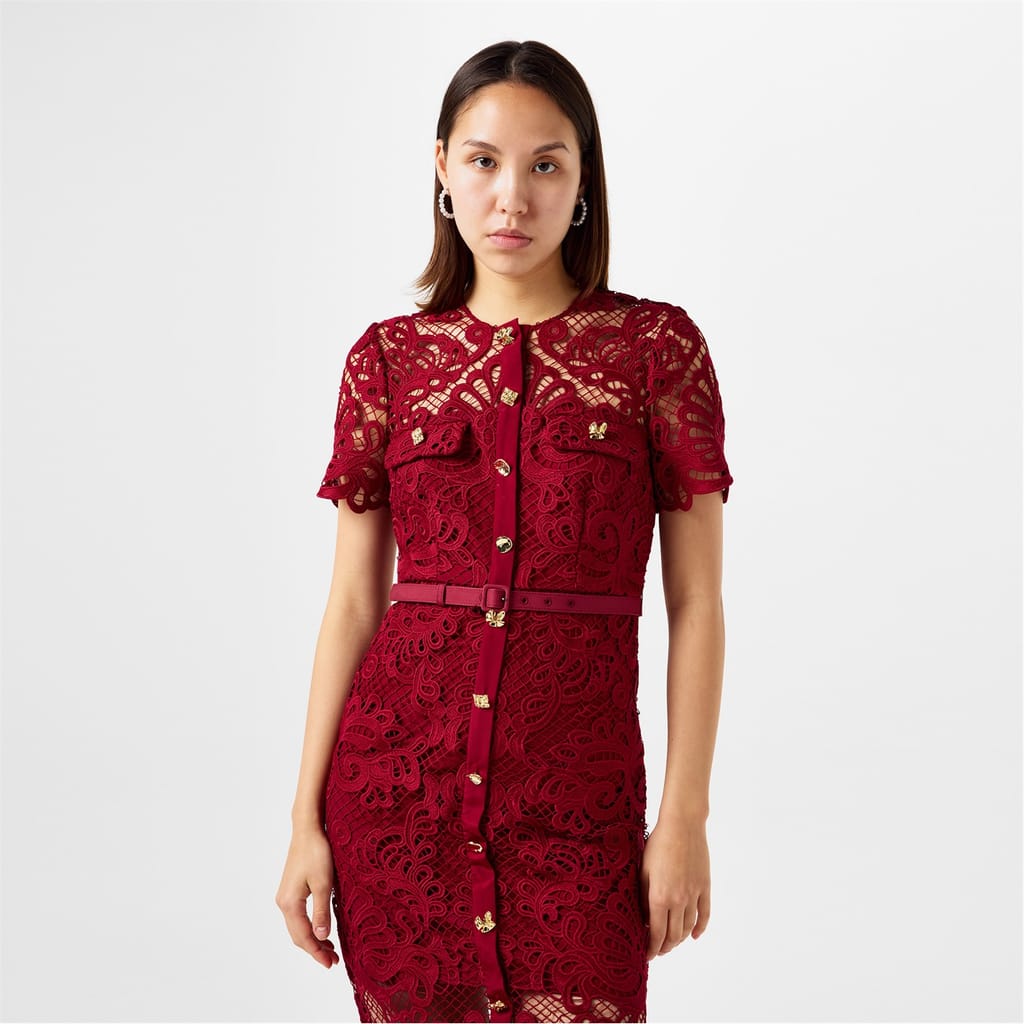 Elevate your occasion wear with Self Portrait's Guipure Lace Button Midi Dress, a contemporary luxury label. Embellished with diamanté buttons exuding refinement and glamour. From red carpet events to opulent galas, this midi dress brings a modern edge to a classic silhouette.