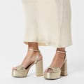 A stunning open toe 12cm platform in metallic gold leather. A buckle tie ankle strap gives you the comfort for extra support.